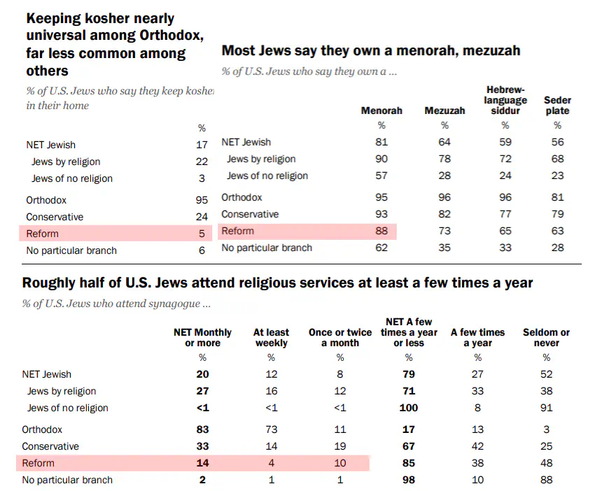 מתוך הסקר של מכון Pew: הרפורמים לא מקפידים על כשרות וכמעט שלא הולכים לבתי כנסת. אבל היי, יש להם חנוכייה בבית רצון להילחם ב"מונופול החרדי על היהדות"!