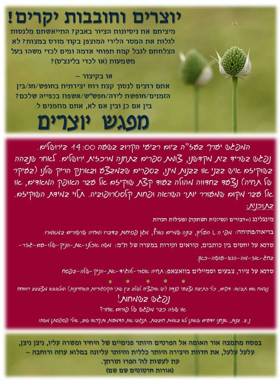 בסניפים בהם מתקיימת סדנא (של הרכזים) נשמח אם נשתף אחד את השני בחוויות, נספר איך היה.