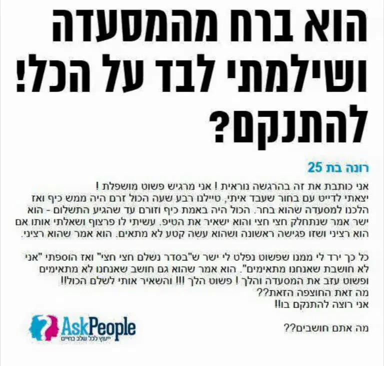 (כמו שאמרה 'בת 30', ''כשכבר מציעים לך הצעה טובה, אז תתייחס, ומה זה משנה איך השגנו אותה'')