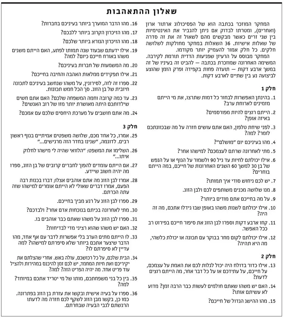 מצאתי את השאלות של ד"ר ארון בגוגל, סדרה של 36 שאלות. את השעתיים הבאות העברנו בהחלקת האייפון שלי על השולחן, מציגים את השאלות זה לזה.