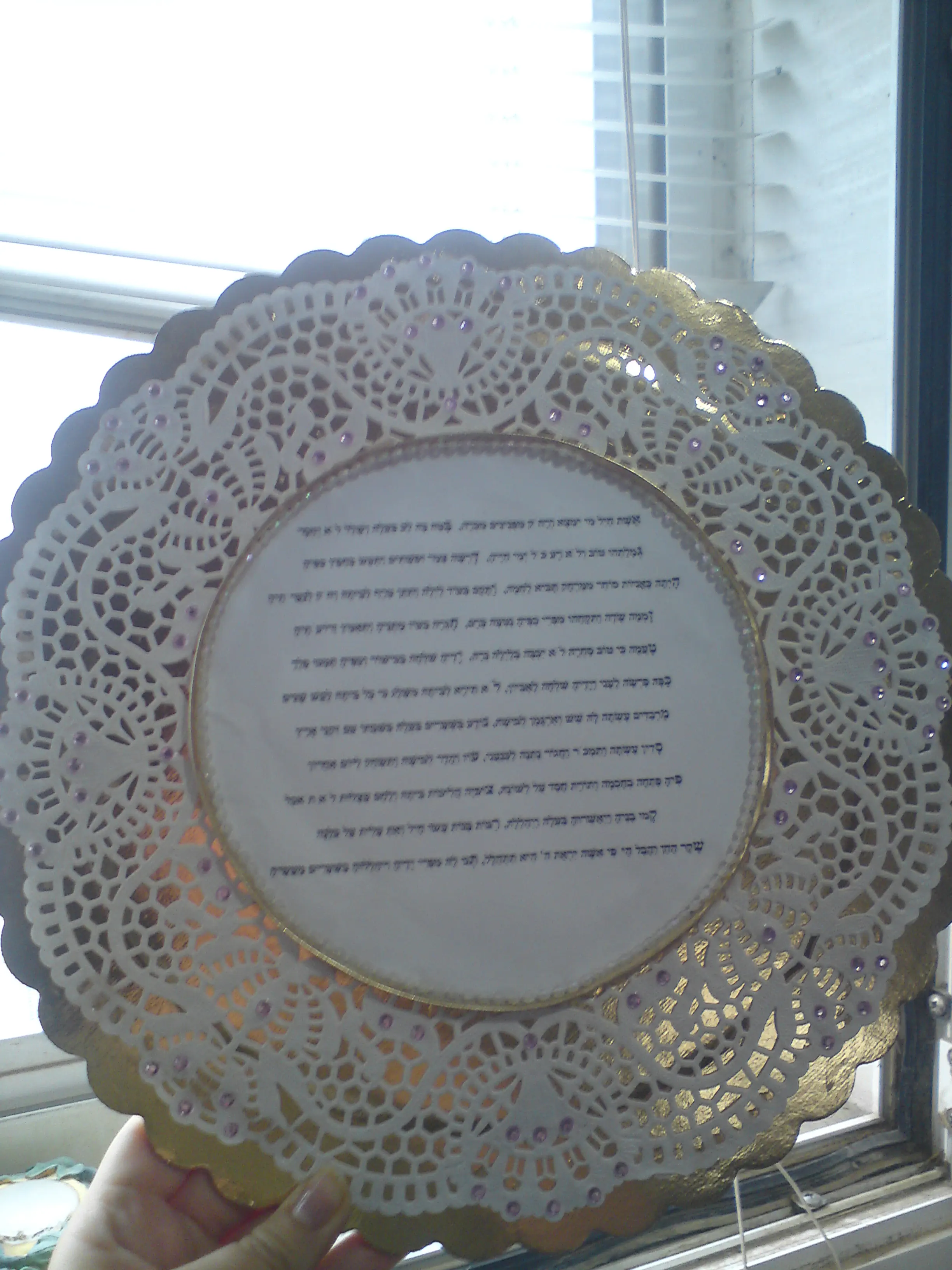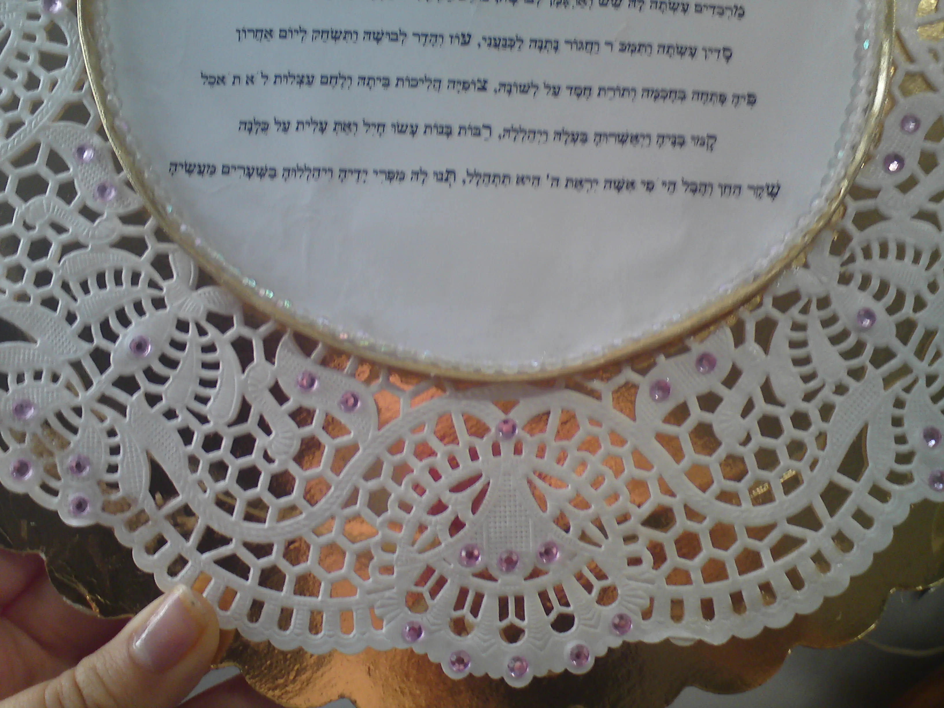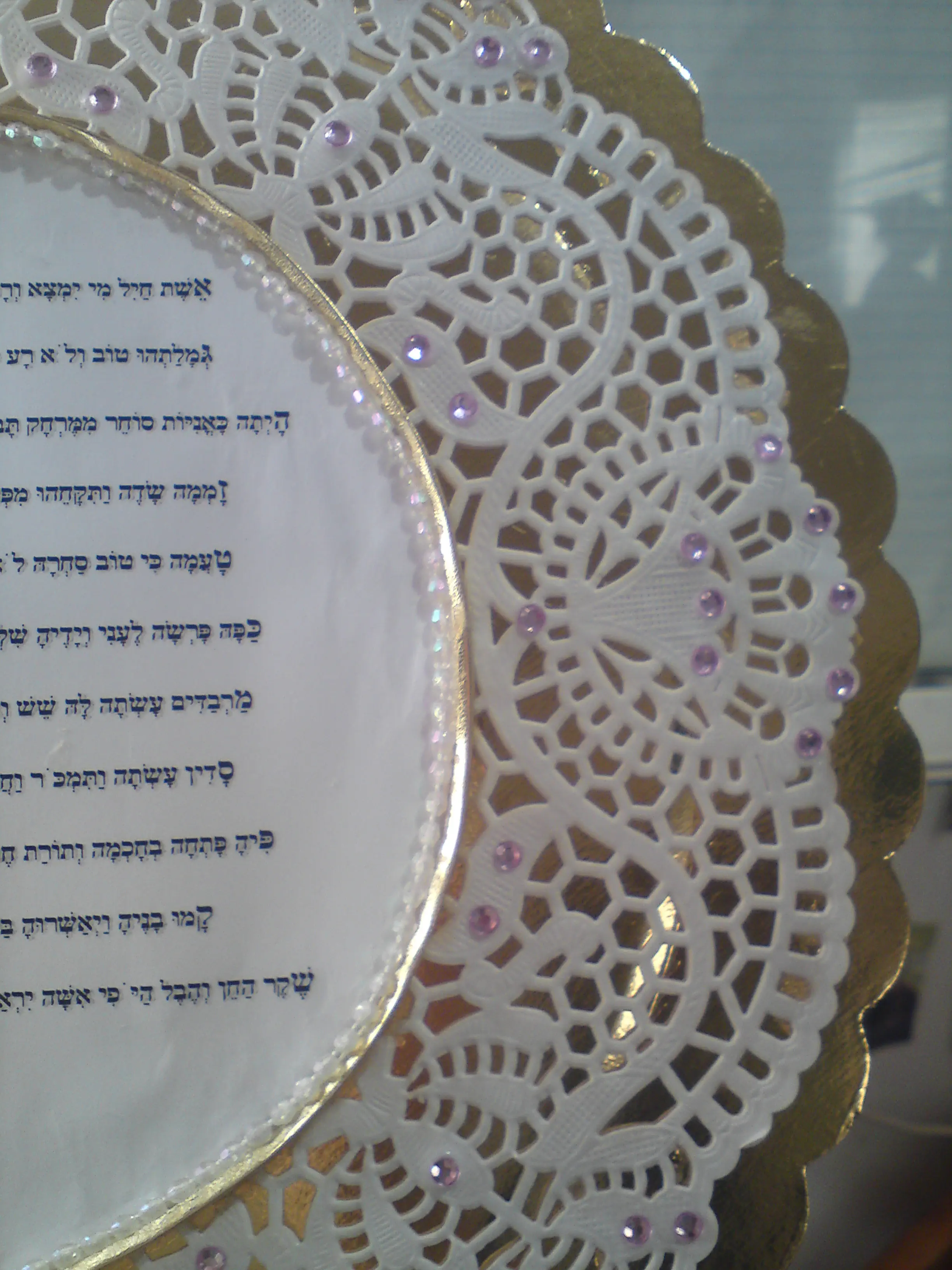 באמצעה של מפית התחרה הדבקתי את נוסח ה"אשת חיל" (או ברכת כלה במקרה שלך..) אותה עשיתי במחשב, כמו ש'אילה שלוחה' הסבירה..
