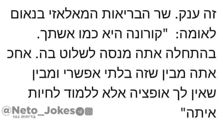 הקורונה זה כמו גבר. בהתחלה את חושבת שזה בלתי אפשרי לחיות עם זה והאופציה היא היחידה היא להפטר מזה. בסוף, את מבינה שאפשר לשלוט בו.