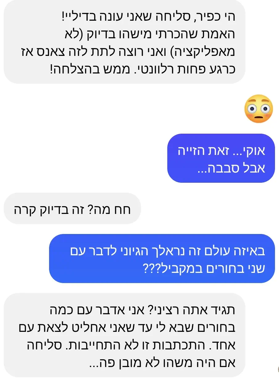 הרי מישהי שמכירה אותך באפליקציה לא באמת מכירה אותך, היא פונה אליך (או נענית לפניה שלך) כדי להבין האם בכלל היא מעוניינת בקשר איתך.