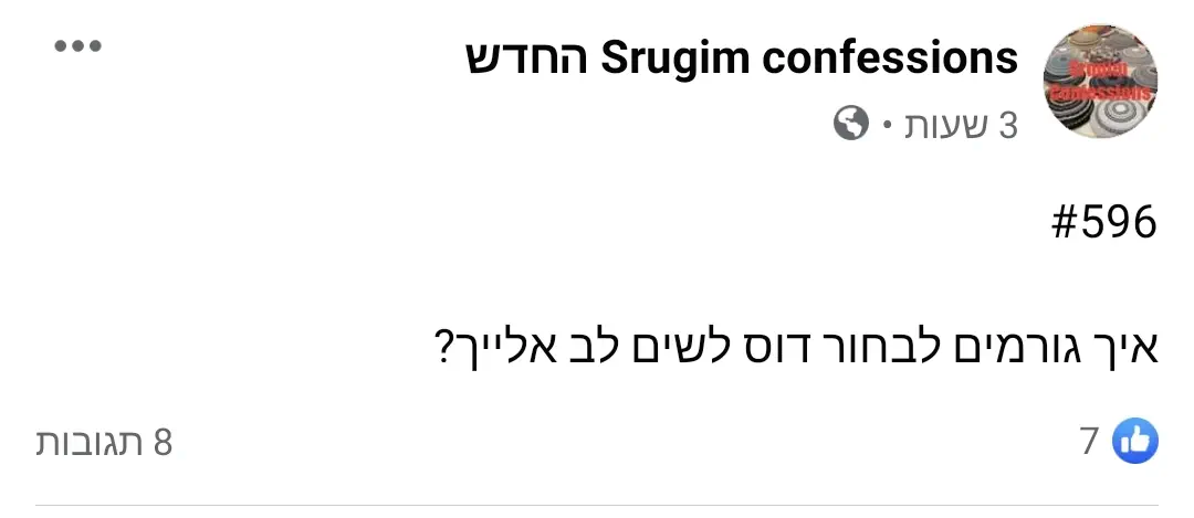 בסביבה שלי, בכלל לא מדברים על נושא הזה של דייטים וחיפוש זוגיות. זה לא נושא שנמצא בשיח, זה לא נושא שתופס מקום במרחב החברתי. כל אחד משתף או מתייעץ רק עם החברים הכי קרובים אליו, ואף אחד לא יודע מי יוצא או לא יוצא. לרוב אתה יודע שמישהו יוצא לדייטים רק כשהוא מתארס. וממילא פחות חושבים על להציע הצעות.