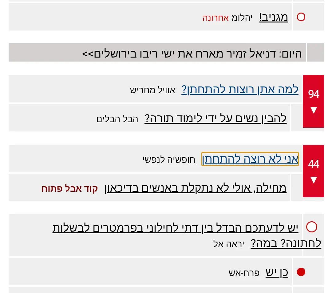 שנזכה לשמוחהכוונה אחת שרואה ביהדות כעבודה רוחנית. לא מסגרת של חוקים שצריך לעבוד על פיהם אלא כלי להתחבר לה' ולממש את האידיאל שלנו. בתכלס זה אומר בגדול שיח של עומק וראיה עמוקה של המציאות. זה אומר להמשיך ללמוד תורה ברמה כלשהי גם אחרי שעזבת את המדרשה, או לפחות לרצות ללמוד גם עם אין לזה זמן כרגע. בישיבה אומרים לי הרבה שאישה לא צריכה להיות חברותא, אני לא מחפש אחת שתהיה חברותא - אבל שלפחות תבין את השפה. שתרגיש קצת את הגעגוע...