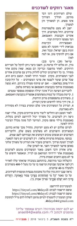ואולי אפילו אפשר להציע לאדם שאתה סומך עליו שכר שדכנות גבוה כתמריץ, או לפנות למדרשה שהבנות שם בסגנון שלך... רק לא להמתין... ואגב לא ראוי שאמונה תהיה תירוץ לחוסר מעש או חשש מיוזמה (אגב זה נכון במיוחד לבנות. אשתו של שאול המלך בחיר ה' הגבוה והנאה יזמה את הקשר וזכתה בו - הוא ברח ממנה והיא לא ויתרה... וגם אביגיל הצדיקה 'בטעות' גילתה את שוקה ליד דוד המלך, וכך גרמה לו לרצות אותה, גמ' מגילה יד,ב. ועכ"פ אני בטוח שבחכמתכן הנשית בכ"מ תדעו איך למשוך בחוטים ולהשאר מאחורי הקלעים. וכל הדברים שכתבתי רלוונטים גם לבנות).