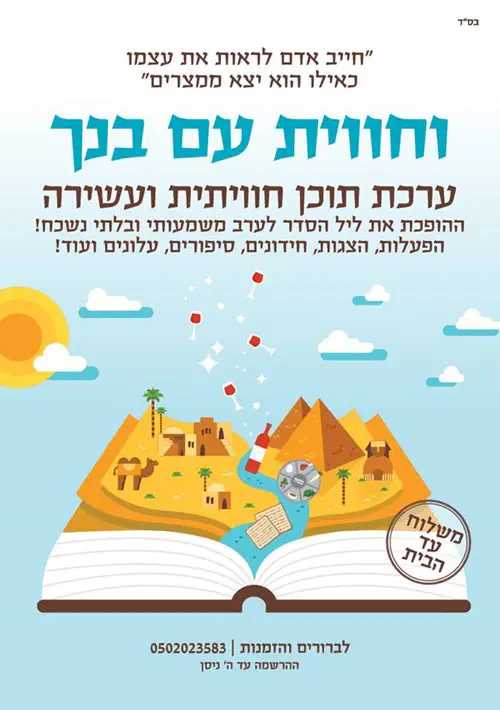 2. הצגה על יציאת מצרים- מאלתרים ציוד בבית- סדין לבן, מקל של מטאטא, משהו על הראש ומדגימים יציאת מצרים ושלא הספיק הבצק לתפוח (אפשר לעשות את זה כהפתעה לילדים ואפשר לתכנן מראש)