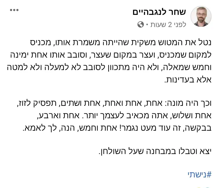 ובאמת זה מאוד הקל. מהרגע שהבנתי את הצורך שלי בזמן הזה, וחשבתי איזה דברים אני יכולה לעשות שיתנו לי כוח וימלאו אותי, ופיניתי באופן יזום זמן לדברים האלו, זה נתן הרבה יותר כוח לשאר היום.