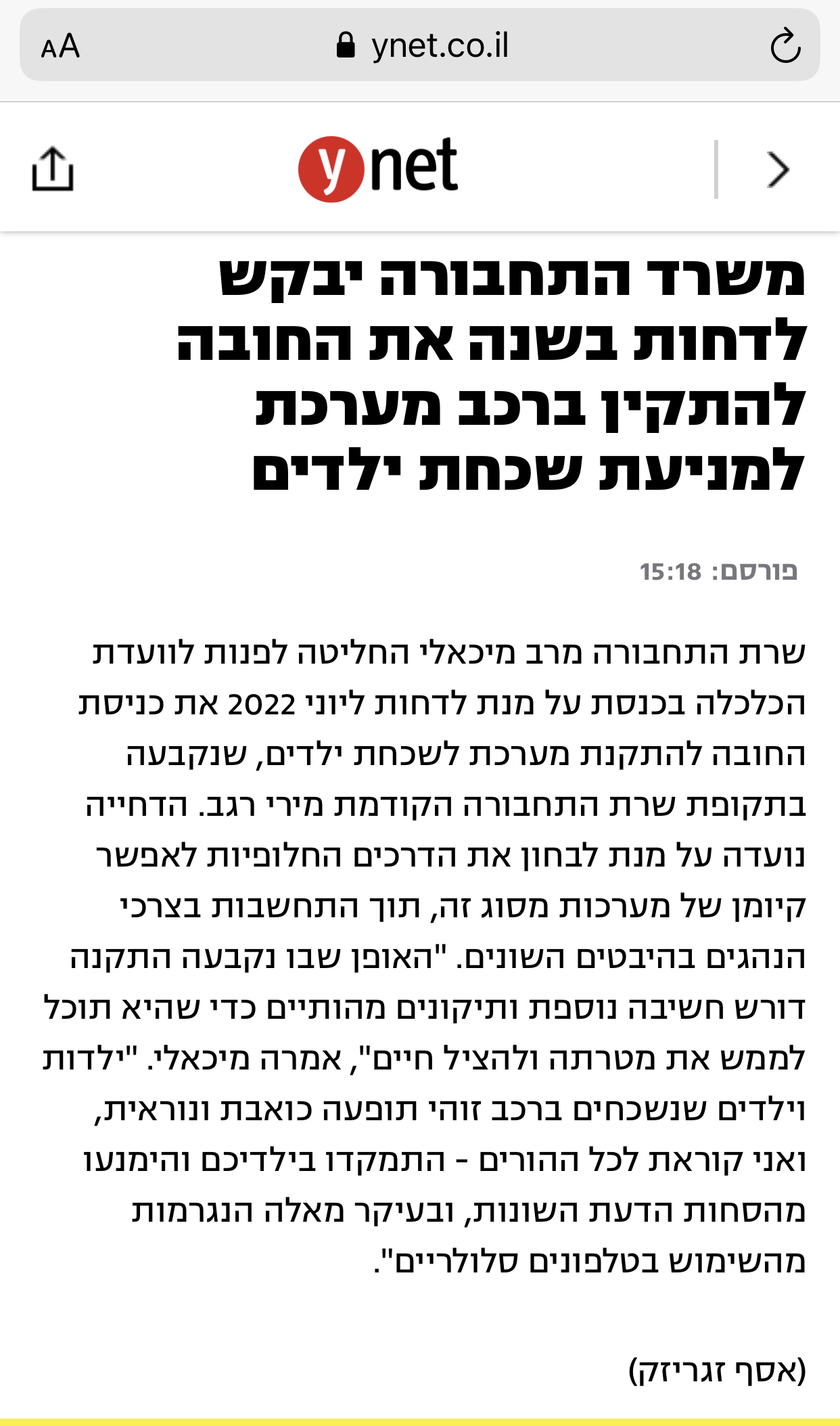 נדחה בשנה - התקני בטיחות למניעת שכחת ילדיםעץ הזית