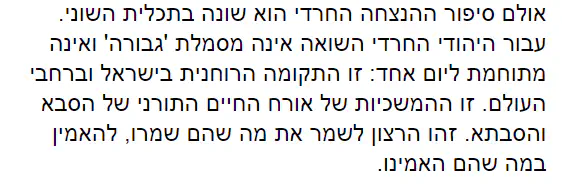 לא בכדי המשיח הוא דווקא עני ודווקא יושב על חמור ועוד כתוב שהוא מוכה שחין יושב בשערי רומי.. ממש לא דמות הגיבור. אלא שזה הלימוד של היהדות שהנאצים ימ"ש ניסו להחריב- מהי הצלחה? שלמרות הכל, למרות שאני נראה כמו שאני נראה, למרות שאני מוכה שחין מבחינה חיצונית ואפילו מבחינה פנימית אני יושב בשערי רומי, מחוץ לקדושה- למרות הכל אני מאמין שרחמי ה' אין להם גבול ואין שום ייאוש בעולם כלל. הפך הגרמנים שכל מגמתם היא ייאוש. אם אתה לא נראה כמו שצריך- מוות.