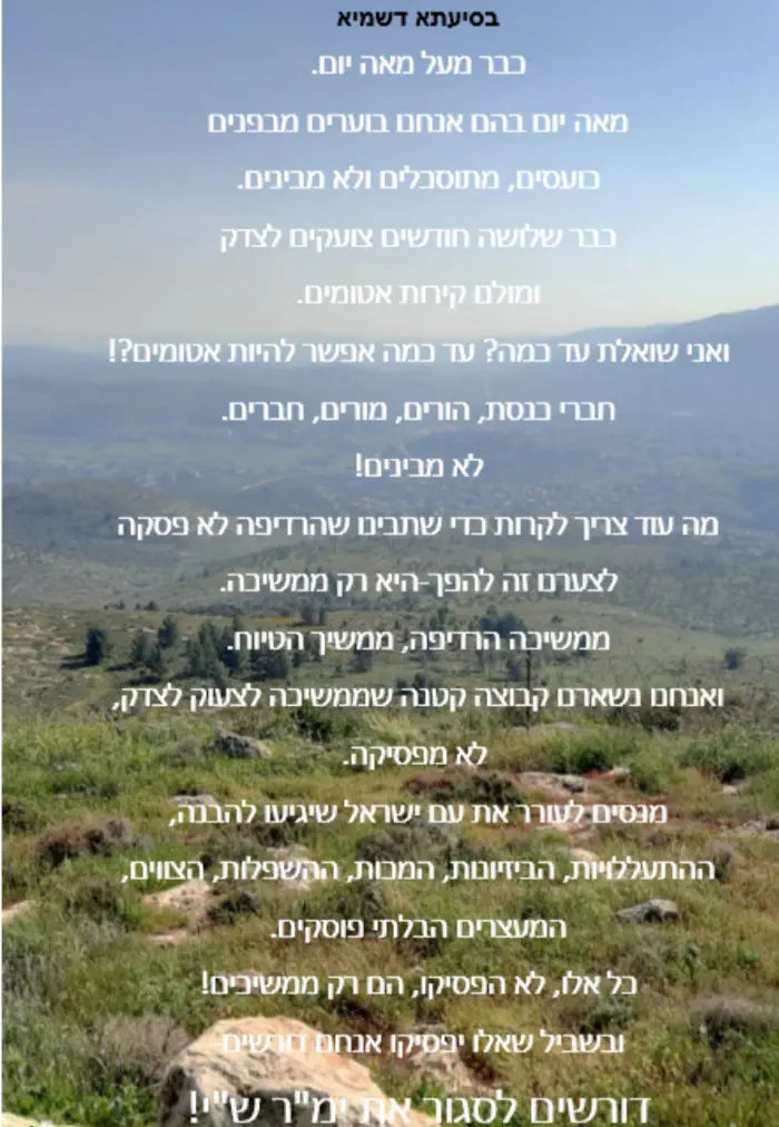 מסופר על החסידים בגטו ורשה שרצו מאוד לקיים את מצוות רבינו "מצווה גדולה להיות בשמחה" אך איך זוכים לשמחה בתוך כל החושך הנורא? התייעצו לקחת ספסל והעמידו אותו בתור מגלשה וככה, זקנים עם נערים התגלשו כולם ועשו עוד כל מיני שטויות העיקר להינצל מהגרמנים ומהייאוש. אז אני לא יודע מה אמורים לעשת היום, אולי בפשטות לזכור, אולי גם להצטער קצת שנפלנו לייאוש הזה ולהתגעגע לתקווה, אבל אני יודע מה ודאי אסור לעשות- אסור להיכנע! אסור להיות עצוב.
