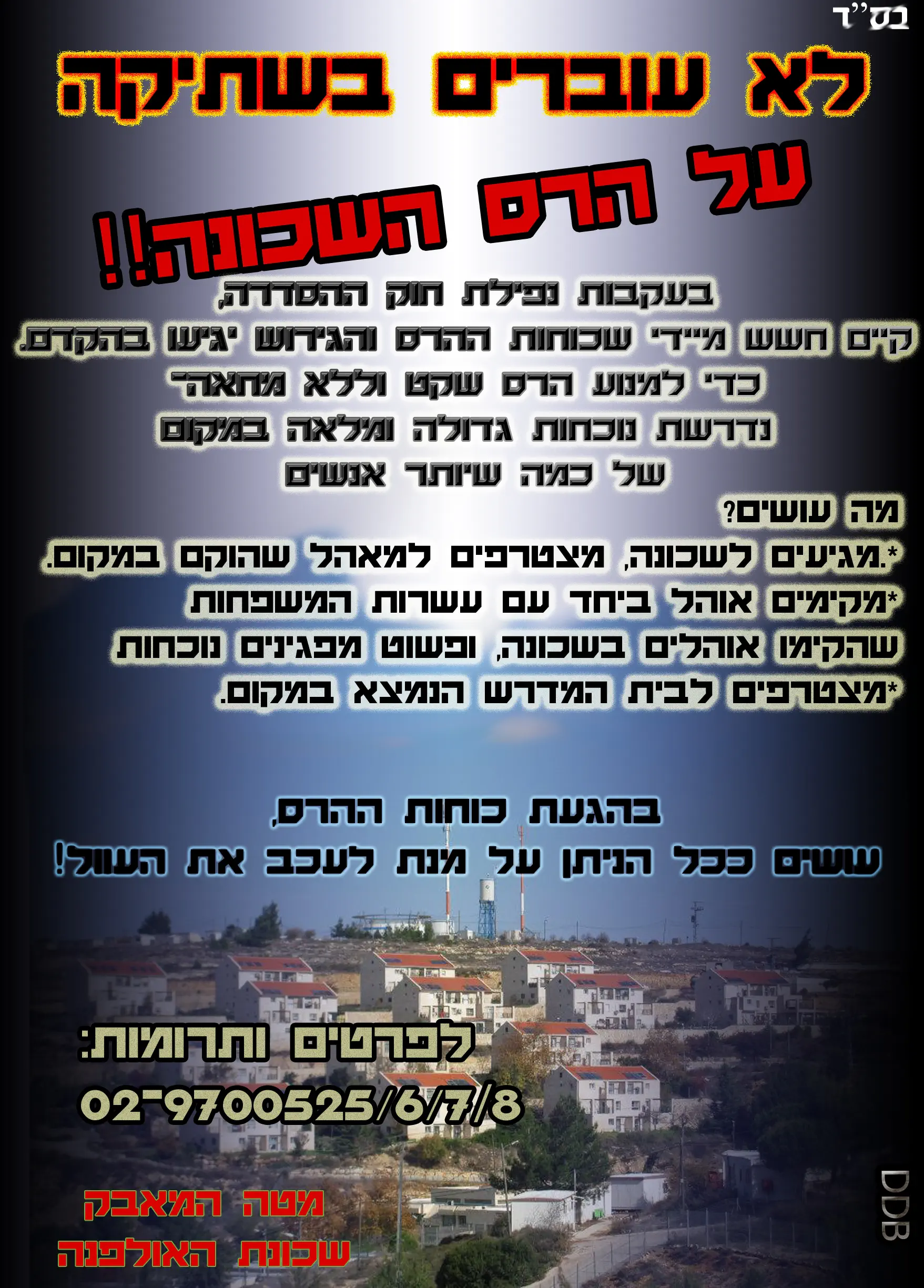 מחר (ד') יעלה בכנסת חוק ההסדרה, מחר זה יום גורלי להתיישבות ביו"ש.