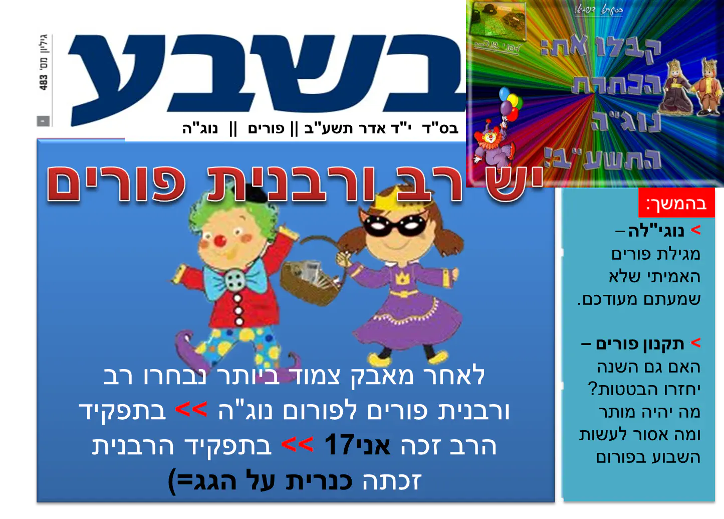 שלום לכם תושבי נוג"ה, עיר הבירה. פורים שמח לכל המוקפים יהושע בן-נון מימות החומה, ושבת שלום לכולם!
