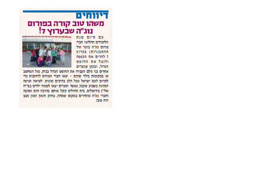 נ.ב.- טובי, את רואה? את לא צריכה להתבייש שאת בזה, גם אם צוחקים עליך! (גם עלי חברות שלי צחקו כשסיפרתי להם את זה "מה אתם מדברים שם, "על תיזירו שטחים לערבים?!? <צ>" "אוי חח את והערוץ 7 שלך הזה!" אבל זאת האמת שלי, זה באמת טוב לי אז אני לא מתביישת בזה, ולאט לאט חברות הפסיקו לצחוק, ועכשיו רק חברה קרובה מאוד, צוחקת על זה ככה מידי פעם...) אם זאת האמת שלי, אם זה טוב לי באמת, אז ממה אני מתביישת ממה אני פוחדת?? (צריך לפחד רק מה'! ואם זאת לא האמת שלך, אז מה את עושה כאן בכלל?!?)
