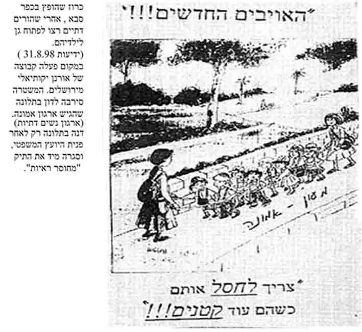 להלן ציור ,שהופץ , ולמעשה זכה לגיבויץ ראי הכיתוב משמאל ( אולי בחלק מהמסכים צריך לזוז שמאלה: "האויבים החדשים" , הם הילדים היהודים בדתיים ש"בגן אמונה" ( כיתוב בתוך הציור) ש"צריך לחסל אותם כשהם עוד קטנים" (בתחתית. ) .