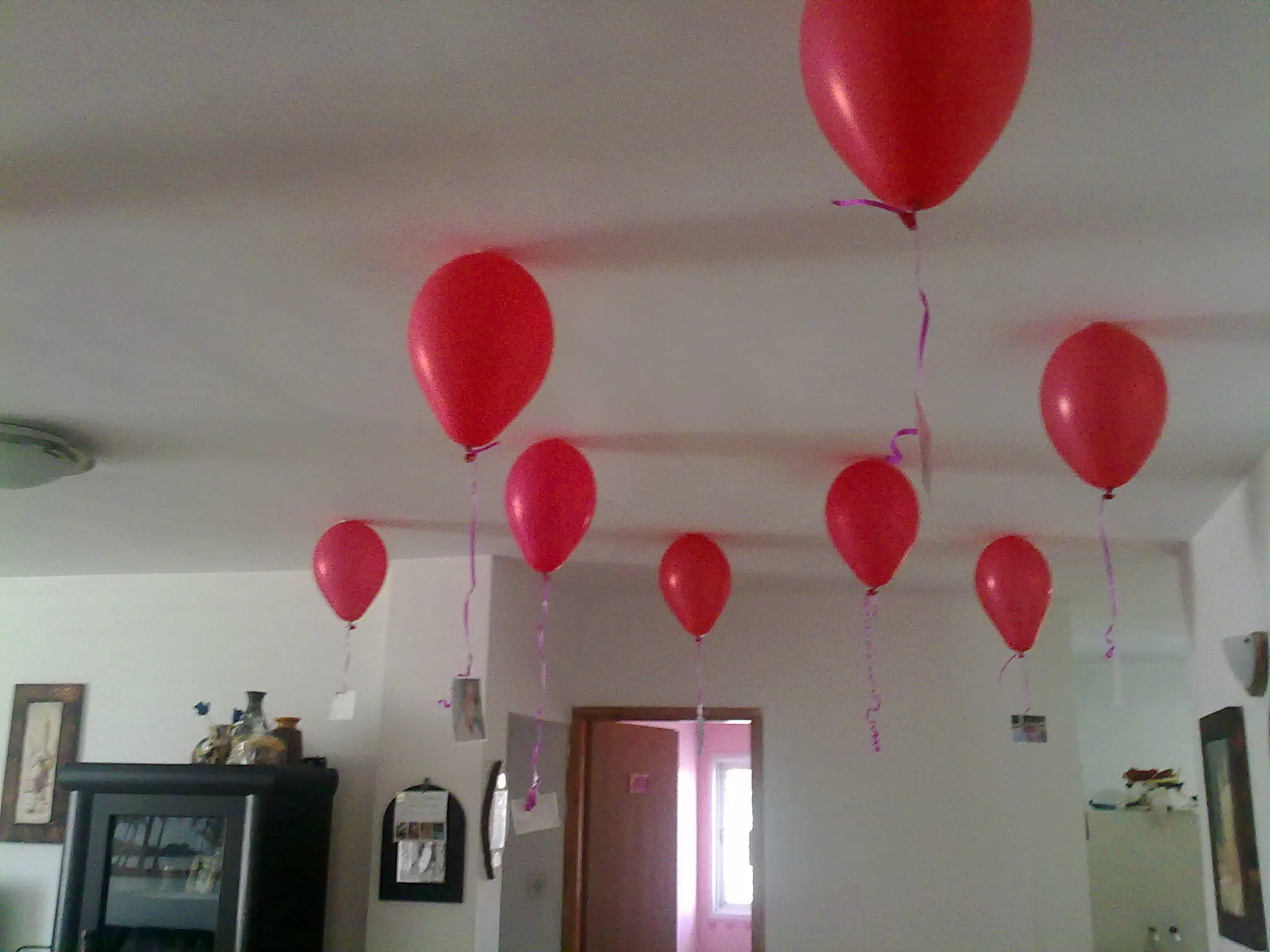 אבל לא סתם תליתי,לקחתי סרט קשרתי..כמו שקושרים לבלון גז..והדבקתי אותם לתיקרה,ומכל חוט של בלון הדבקתי תמונות שלה,ותמונות שלה ושלי ביחד..