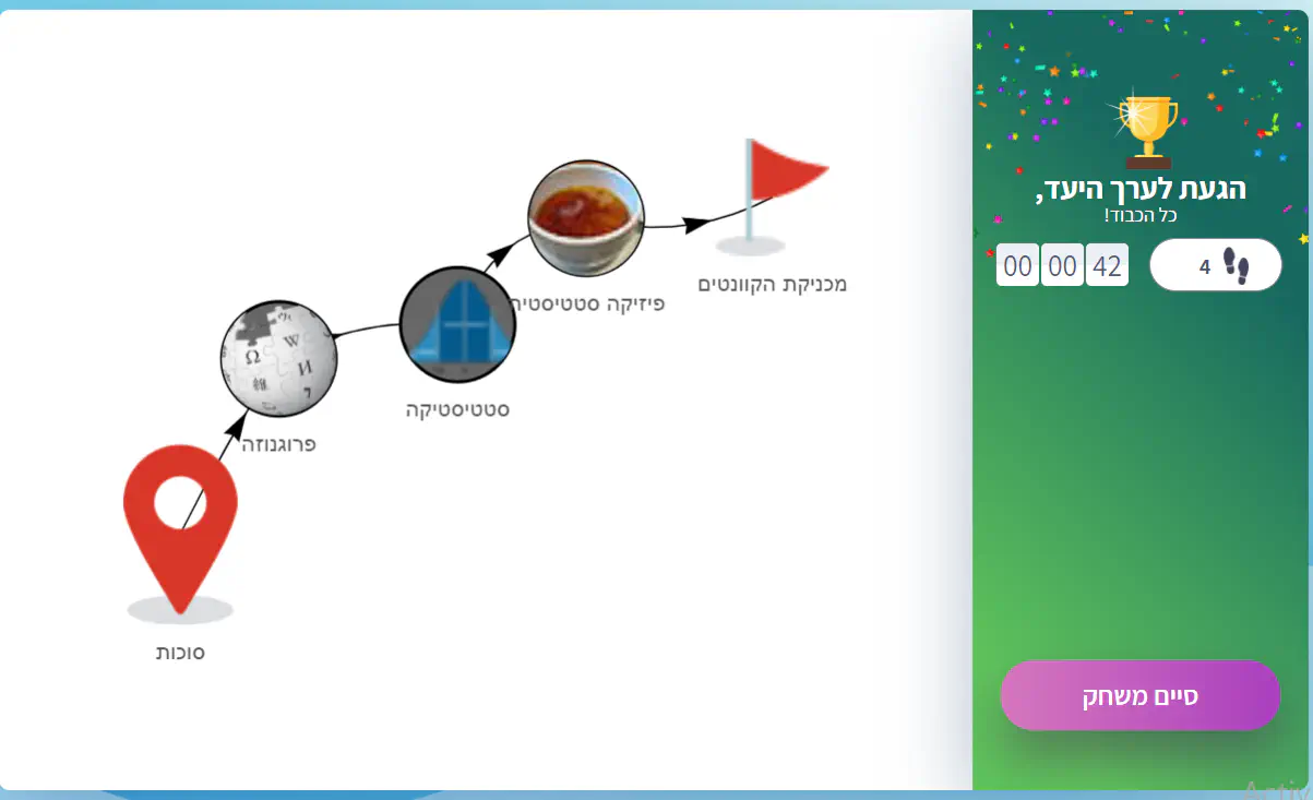 להיכנס וללחוץ על התחל - צריך להגיע מערך ויקיפדיה אחד לאחר בכמה שפחות זמן