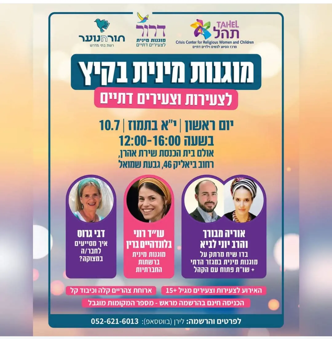 הרב יובל שרלו, דבי גרוס, הרב יוני לביא, עו"ד רוני בלונדהיים ברין ואוריה מבורך בסדרת הרצאות מרתקות על מוגנות מינית בקיץ - טיולים ובילויים, קהילה, חינוך והרשתות החברתיות!