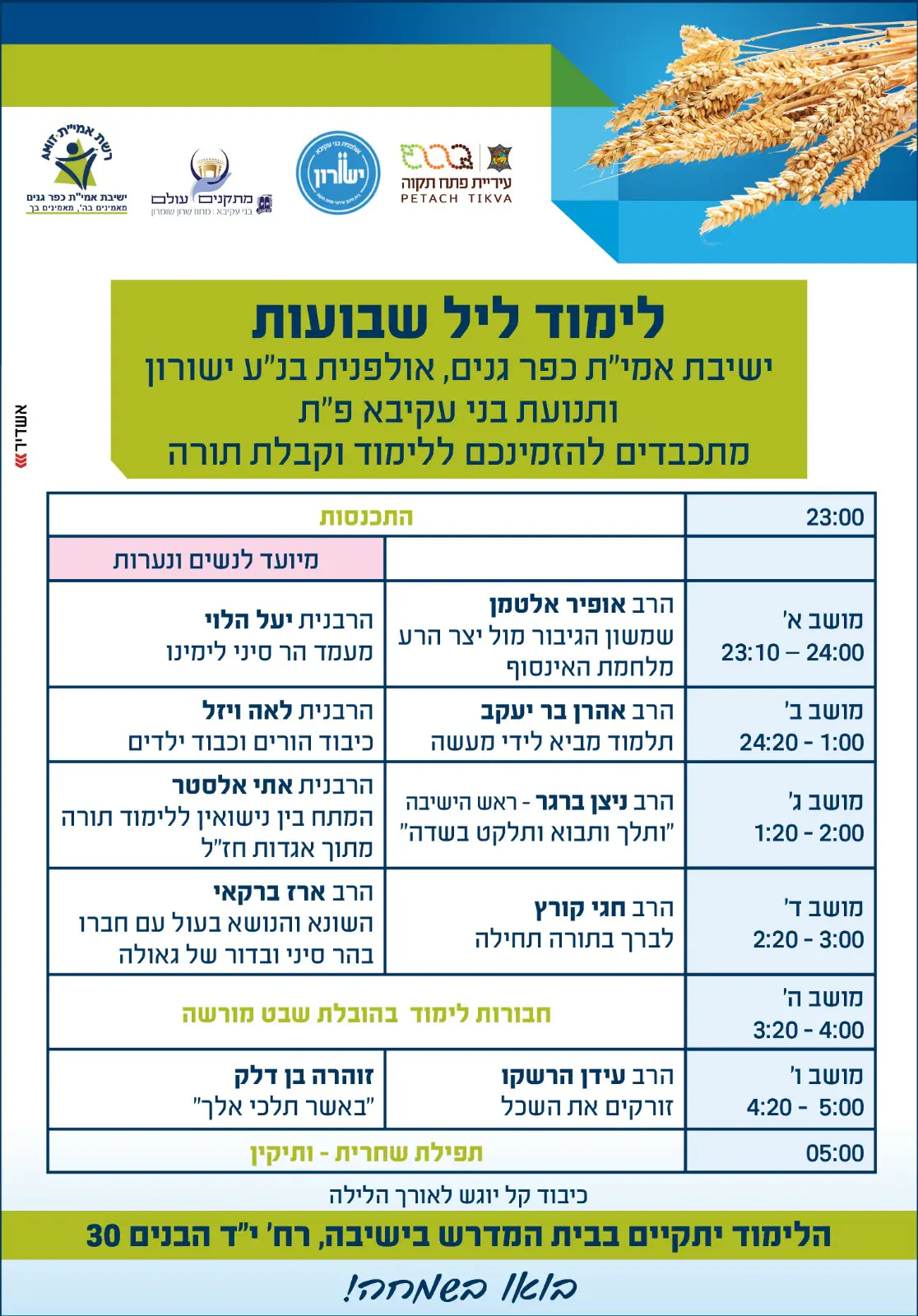 בשבועות מתארגן ליל לימוד שווה במיוחד-כן, כן, גם לבנות (באולם נפרד), בישיבת אמית כפר גנים.