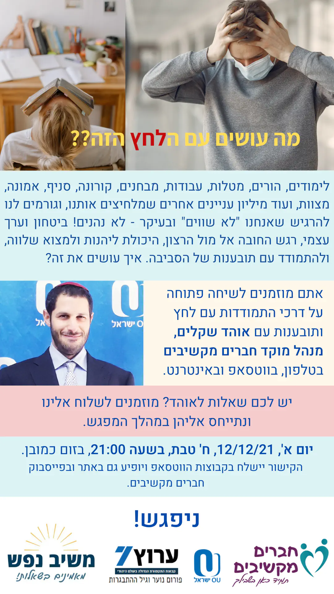 נשמח לפגוש אתכם בראשון הקרוב, ח' טבת, 12/12, בשעה 21:00, למפגש זום עם אוהד שקלים בנושא שמעסיק המון חבר'ה שפונים אלינו לחברים מקשיבים: מה עושים עם כל הדרישות האלה? לימודים, מטלות... יש כל כך הרבה מדדים ומטרות, ולפעמים אנחנו לא עומדים בעומס! מרגישים לחץ, מועקה, דכדוך...