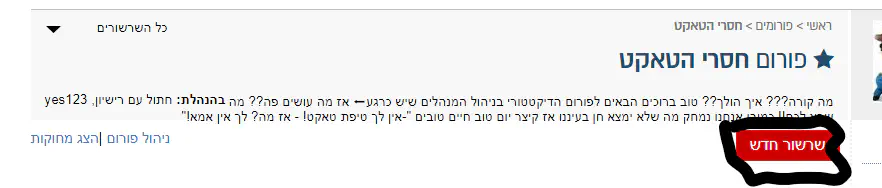 איך פותחים שרשור?? תיכנסו לפורום מסוים (לצורך העניין חס"ה) ולחצו על הכפתור האדום למעלה "שרשור חדש"