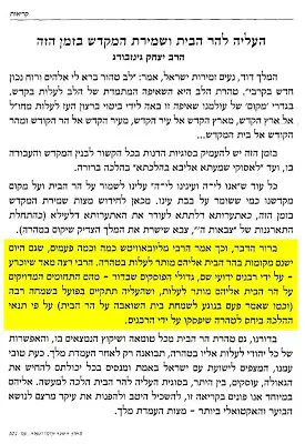 נ.ב. פשוט אשר במצב הנוכחי בכל כיו"ב הנמשך עשיריות בשנים בכיון אחד, מימין (- אש דת למו) לשמאל - שהנני בכל התוקף נגד ההעל[א]ה על סדה"י [=סדר היום] שאלת היתר העליה על הר הבית כי תומ"י [=תיכף ומיד] להתחלת השקו"ט [=השקלא וטריא] בזה יעלו לשם כו"כ [=כמה וכמה] ולמקומות שאיסורן ודאי ר"ל [=רחמנא ליצלן] ומספרם ילך ויגדל ר"ל וכל האזהרות בזה (באם תבואנה) ילבו את היצרים ויוסיפו מספר העולים הנ"ל. וכל מי שיעשה בזה ופשיטא העולה בפועל יותר מעלית זקני ירושלים (תרתי משמע יראה שלם) ידו במעל עליית כהנ"ל. ופשוט.