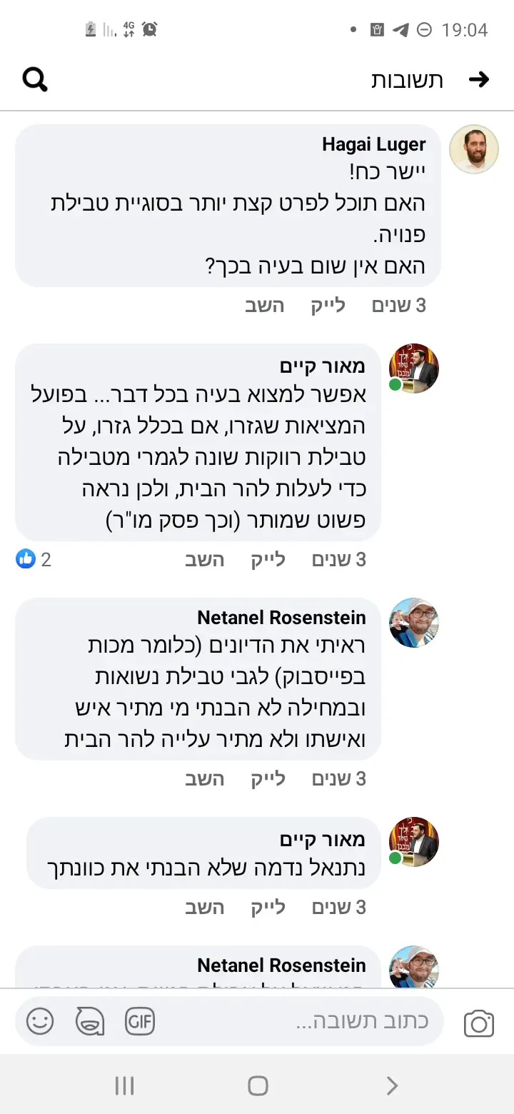 עניתי לו שכל שנה הוא מתחייב בכרת על כך שאינו מקריב קרבן פסח, הוא ענה שכל הרבנים אוסרים עלייה כי לא יודעים את הגבולות, עניתי לו במילים מכובסות שזה בלבול מוח ושאלתי אותו האם הרמב"ם או רבן גמליאל או רבי יהודה הנשיא לא היו תלמידי חכמים.