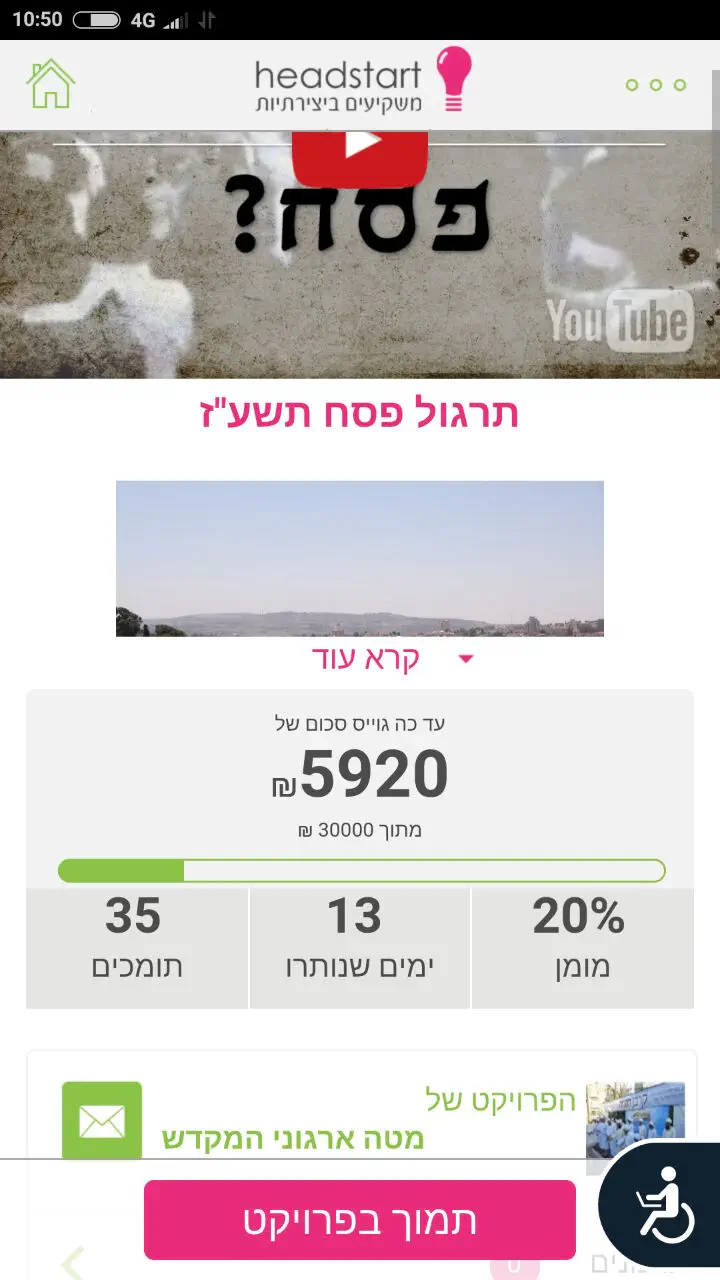 מוזמנים להמשיך ולתרום לתרגול (שהוצאותיו מרובות בהרבה מ30 אלף ש"ח) בקישור: https://www.headstart.co.il/project.aspx?id=22629