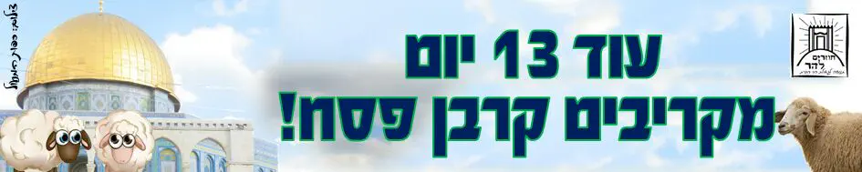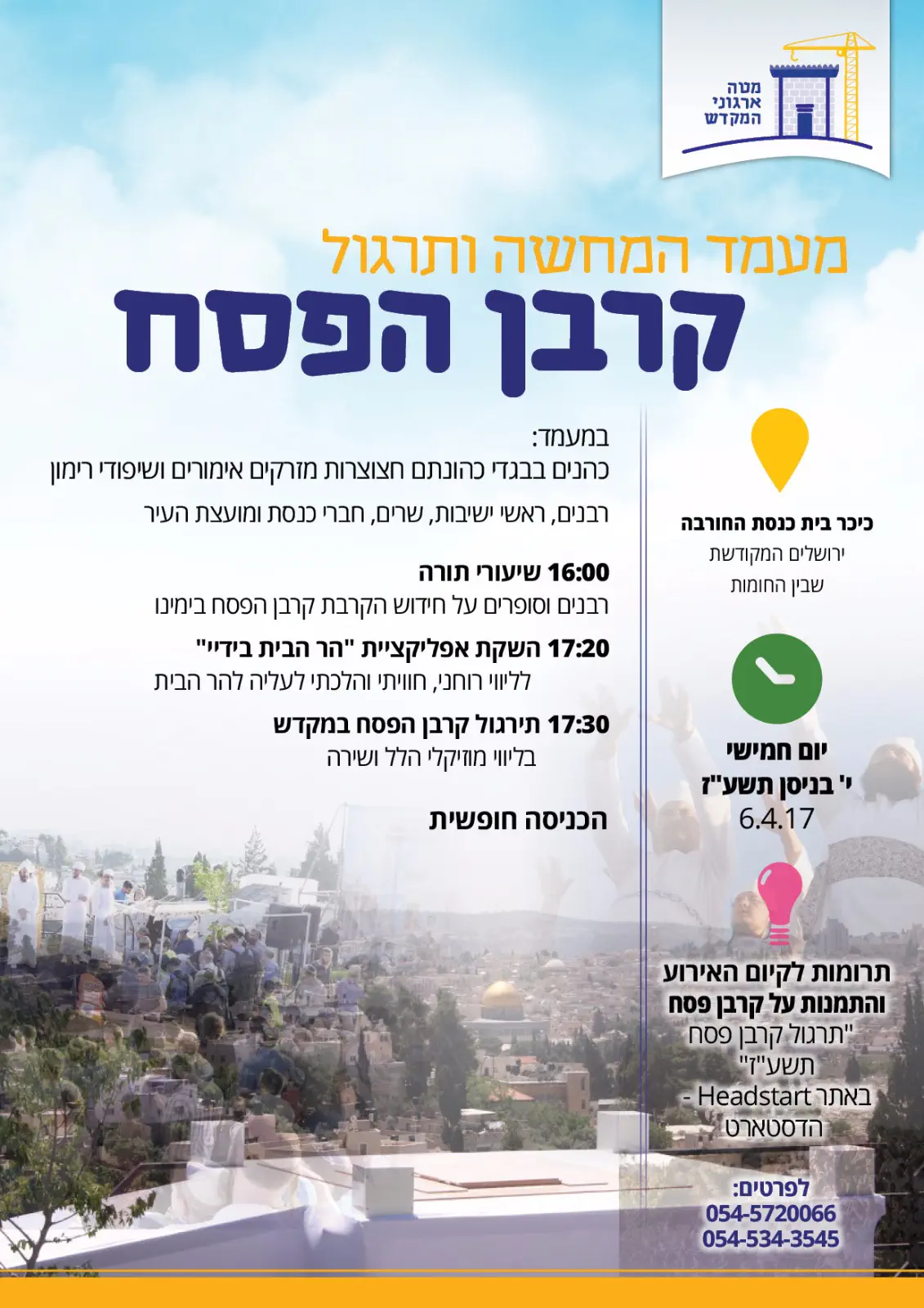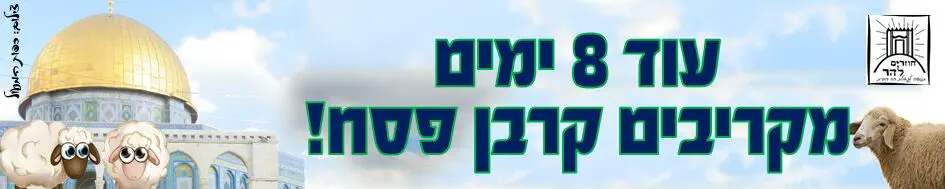 תנועת 'חוזרים להר', הפועלת למען כיבושו המחודש של הר הבית ובניין בית המקדש, יוצאת בקמפיין חדש בו היא דורשת מהערבים לפנות את מתחם הר הבית עד ערב חג הפסח הקרוב. זאת כחלק מההכנה לקראת חידושה של מצוות הקרבת קרבן הפסח, אותה בתנועה נחושים לממש, עוד השנה.