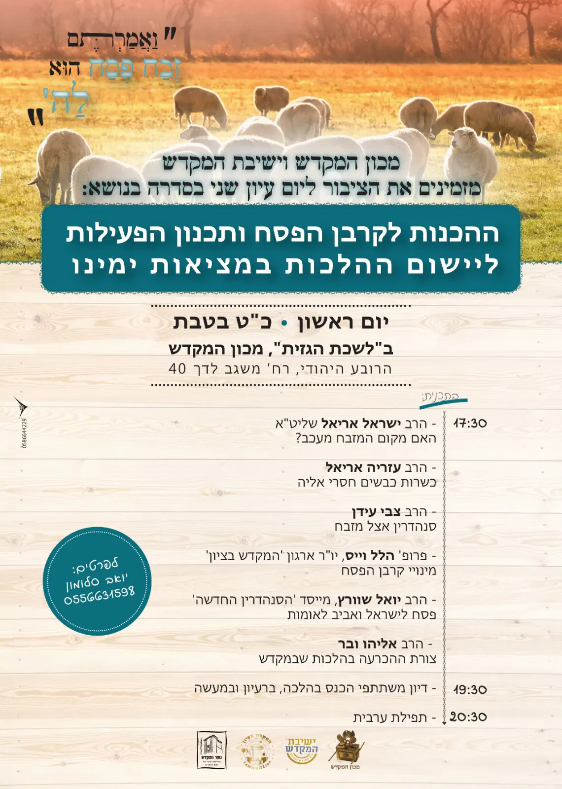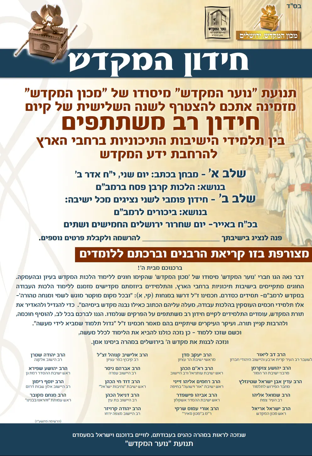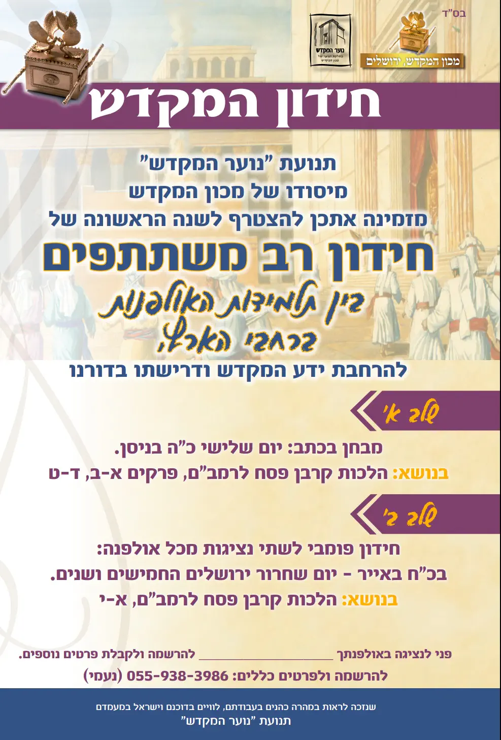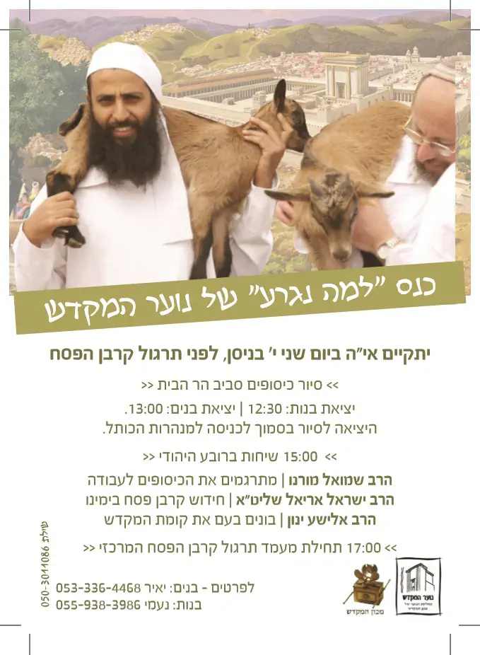 מה בתוכנית? שו"ת פתוח בגובה העיניים עם הרב אריאל שליט"א, שיחה לקראת פסח ולימוד משותף. בתשע ועשרים בישיבת המקדש, מעמדות ישראל 3 (להוראות הגעה - פסיה ברכה 0543488535). בנות שניגשות לחידון מתבקשות להקדים בעשרים דקות כדי לשמוע הסבר טכני על החידון. חשוב מאוד להגיע! נפגש;) אני לא מכליל.