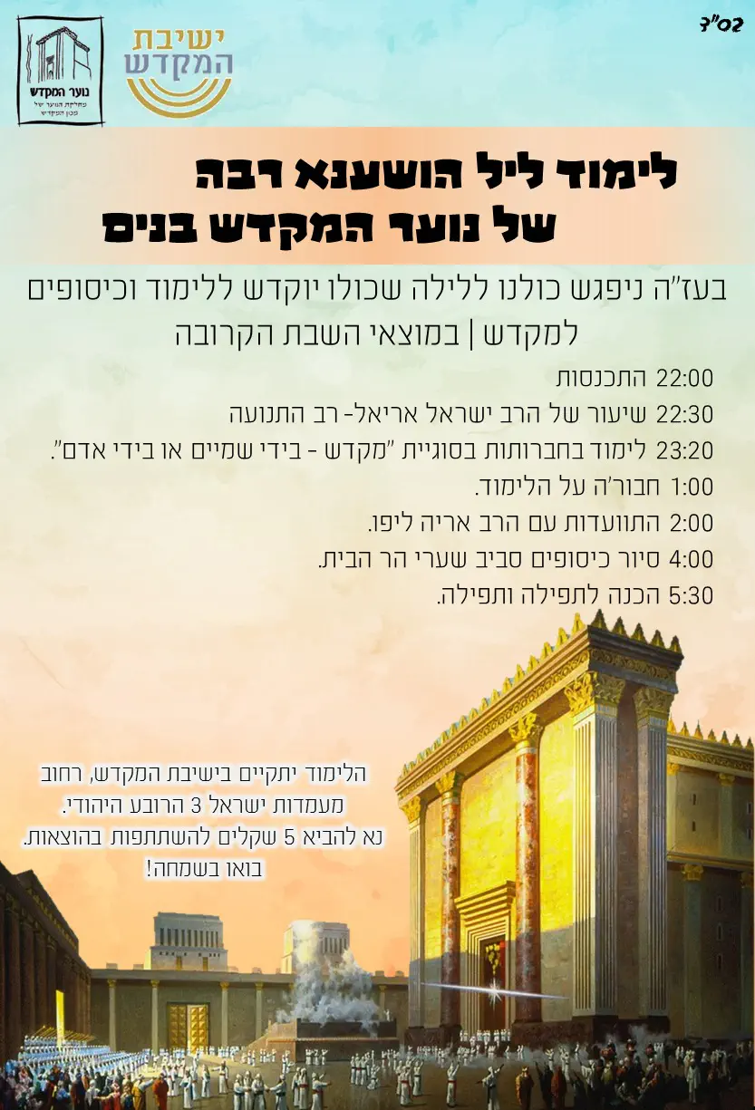 20:00- דיון על קידום בניין המקדש. בנים- בישיבת המקדש ובנות במכון המקדש.