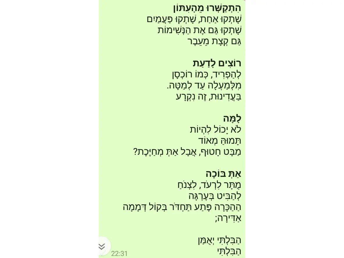 אני רציתי רק לשבור אותה ולסלק אותה מעל פניי, ובאותו הזמן לחבק אותה חזק חזק ולהגיד לה- תודה. תודה שאת אי של שפיות בתוך המציאות הלא נומאלית שלי.