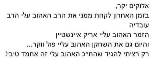 מאחת הערגליות שהוא תפח היה פתק שילד קטן כתב "חייל יקר אני מבקש שתברך לפני שאתה אוכל" (משהו כזה)