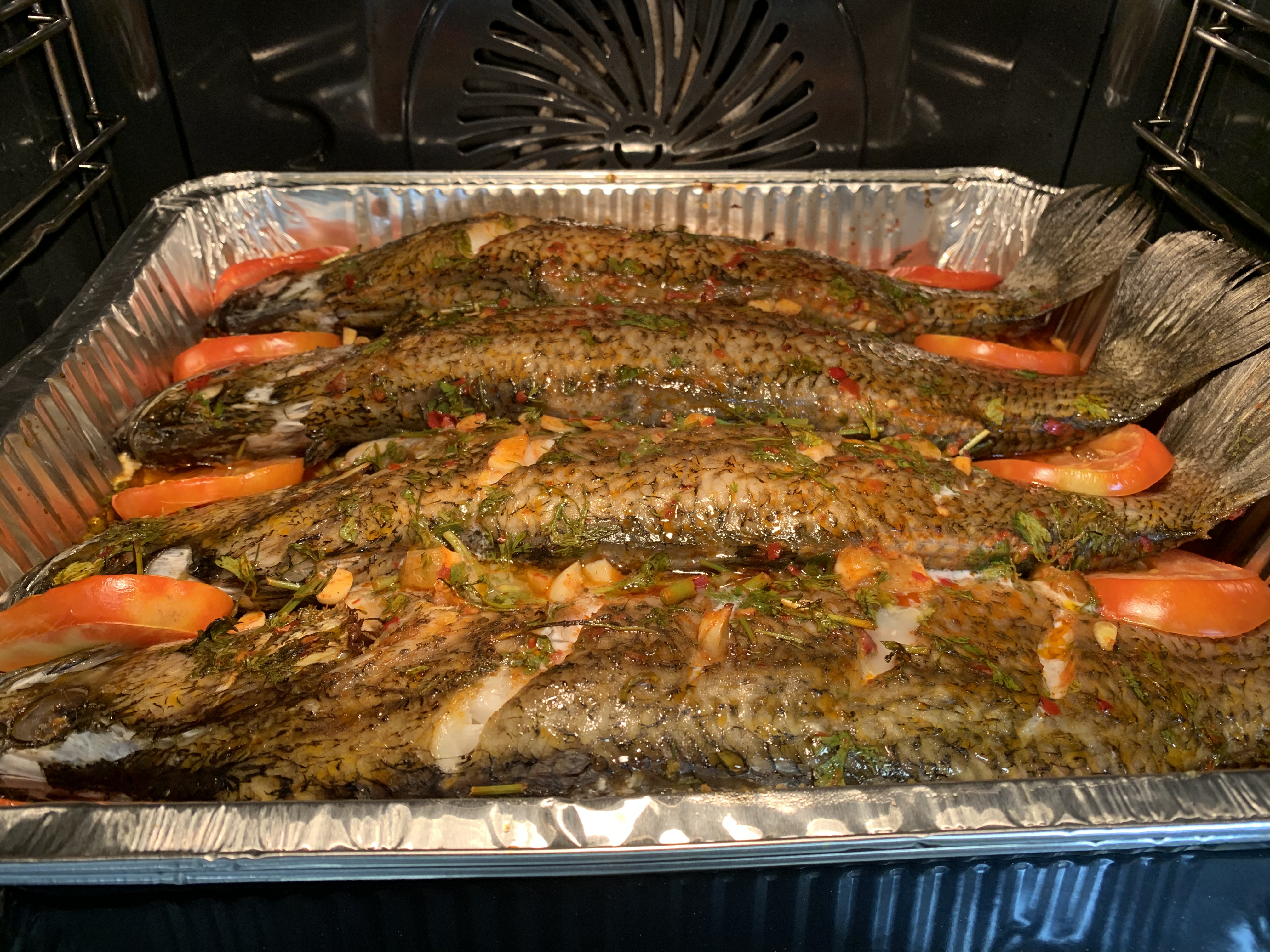 - בינתיים מבשלים את העגבניות המעוכות על אש בינונית/קטנה ומוסיפים כ3 שיני שום שלימות. בודקים עם מזלג שהגמבה קלויה לגמרי (כל 5 דק בערך הופכים אותה צד שתתרכך מכל הכיוונים) ומורידים מהאש. בעדינות מורידים את נייר האלומיניום ומכניסים אותה לתוך שקית פלסטיק סגורה כדי שתתמלא אדים והפלפל יתקלף בקלות, כשהיא מתקררת מקלפים מהקליפה ומוסיפים לסיר. מועכים הכל ביחד ומבשלים מס' דקות.