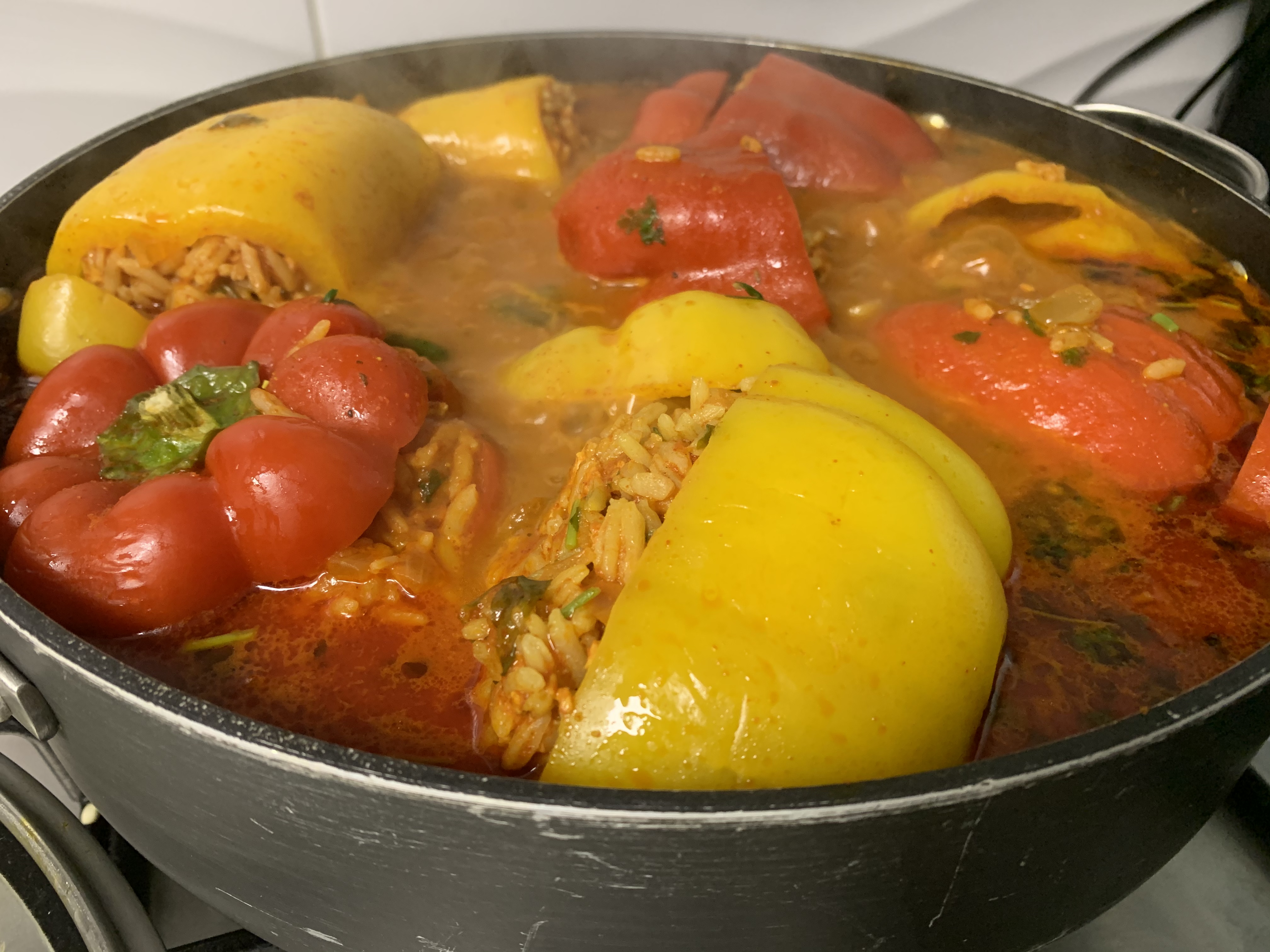 רסק עגבניות פפריקה מלח כוסברה פלפל שחור ( חוויג לא חובה) עד שמבעבע ושמים את הפלפלים מסודרים יפה יפה מבשלים בערך 45 דק לקראת הסוף מוסיפים את הכוסברה הקצוצה דק והאורז שנשאר מהתערובת