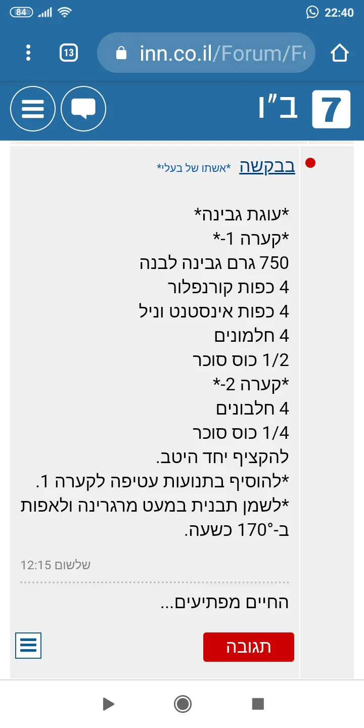 יש לי מתכון לעוגת גבינה כזאת*אשתו של בעלי*