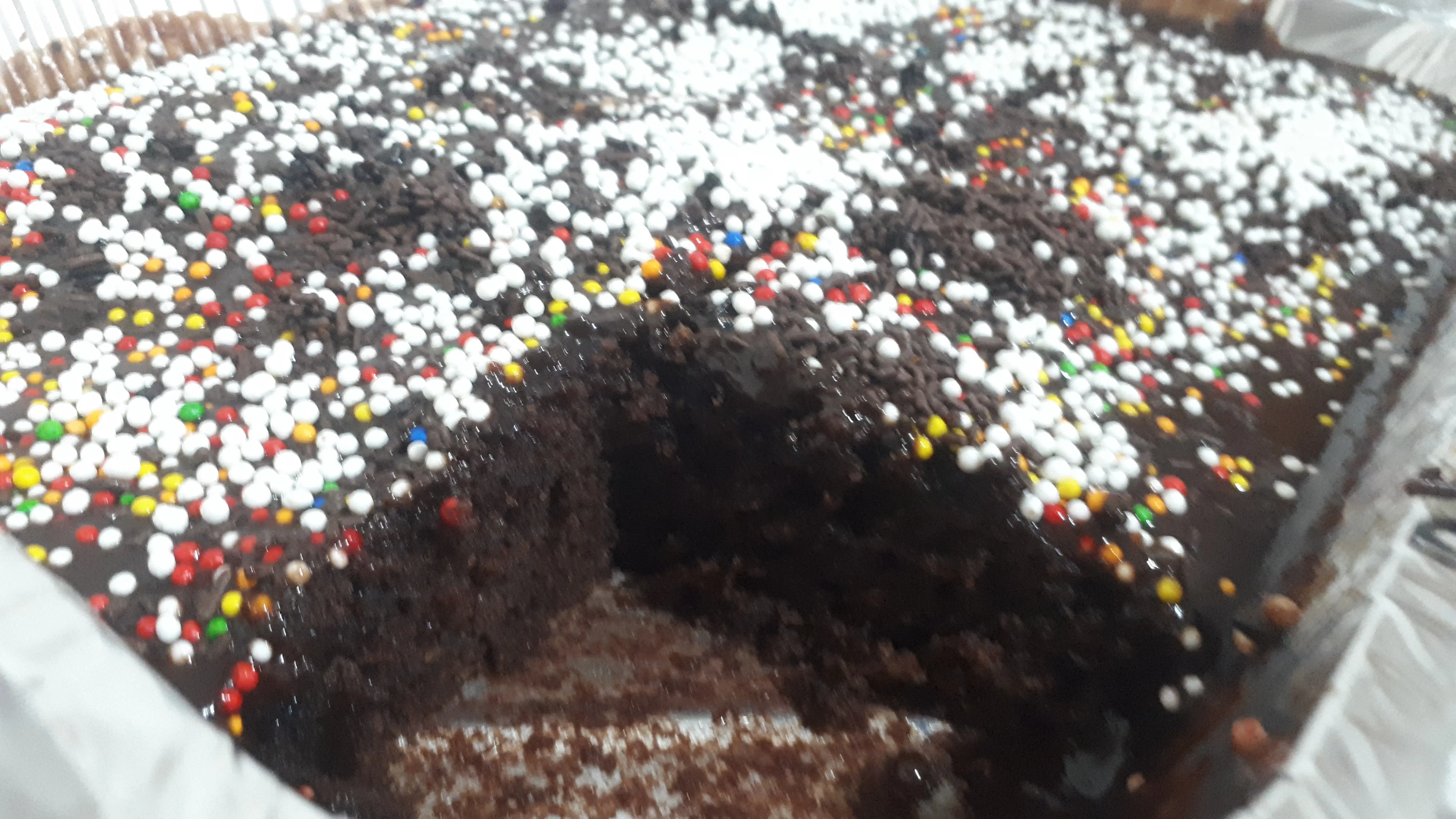 כשהעוגה יוצאת מהתנור רותחת, לפזר עליה קוביות שוקולד (הרבה, שיספיק לציפוי) וכשנמס למרוח לשכבה אחידה.