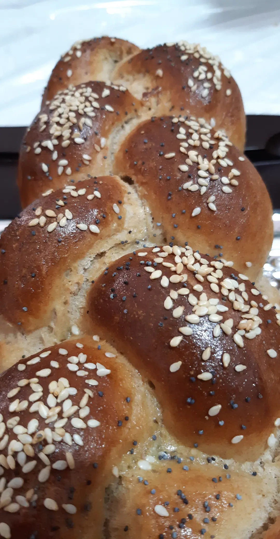 התפחה ראשונה עד שהבצק מכפיל את עצמו, קולעת, עוד התפחה קצרה, מורחת בביצה ושומשום ואופה