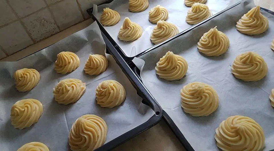 להכניס לשקית זילוף לזלף על נייר האפיה(טיפ נהדר כדי שנייר האפיה לא יזוז להדביק את הנייר עם עיסת הפחזניה לתבנית) לאפות בתנור על טורבו 160 מעלות לא לפתוח את התנור עד שמשחים!!!!!