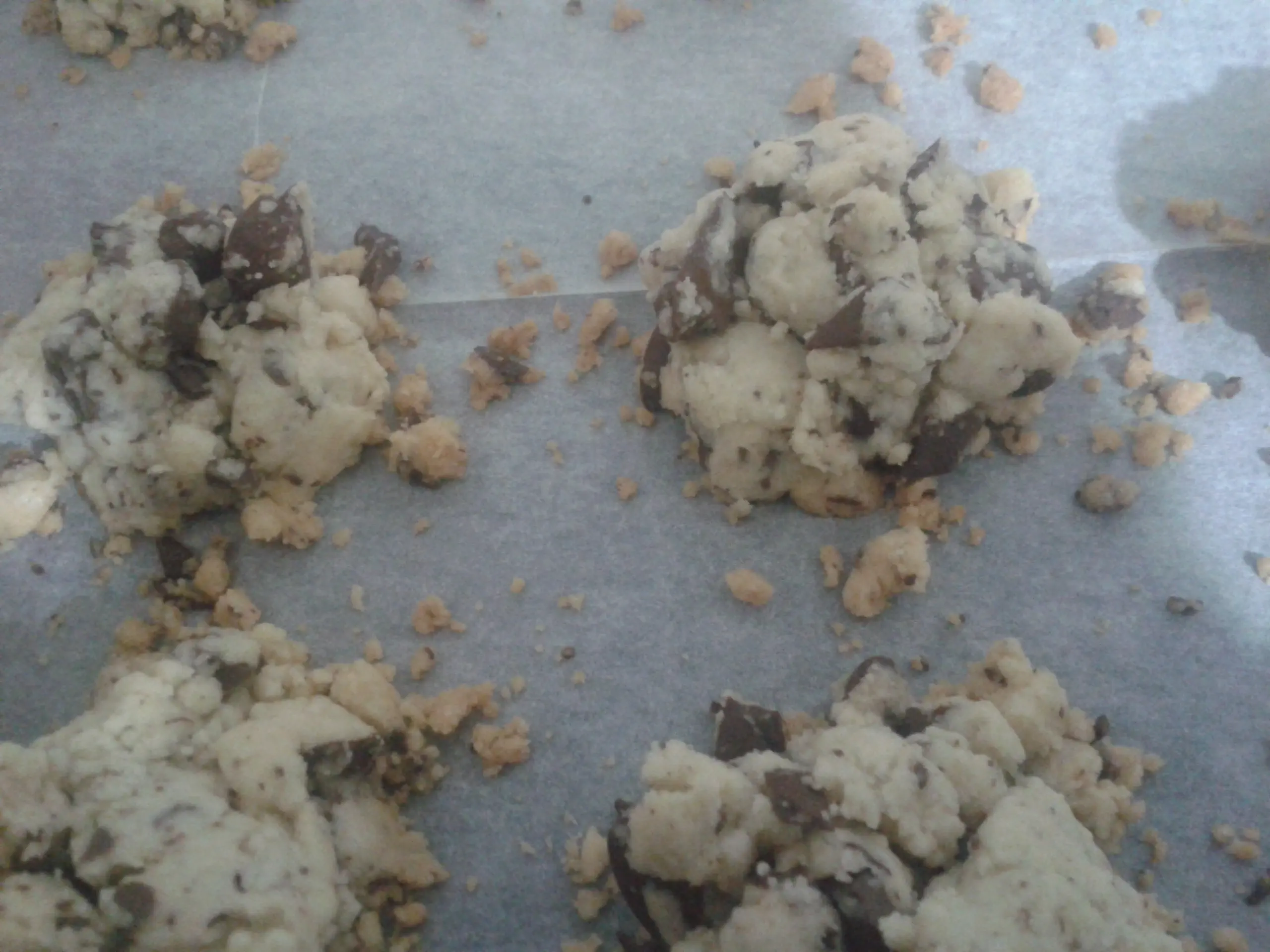 "לפניי האפייה מחממים את התנור, ובעזרת כף קפיצית קטנה של גלידה יוצרים כדורי מהבצק. הבצק הזה מתנהג אחרת מבצק פריך מסורתי, והוא הרבה יותר פירורי. ולכן נעזרים בכף הקפיצית כדי לקחת את הכמות הדרושה של הבצק, מגלגלים אותו מעט מאוד בין הידיים רק כדי ליצור כדור אחיד. גם השוקולד צ'יפס נוטה מעט לברוח מהבצק ולכן אפשר להדק אותו לכדורי הבצק בחלקם העליון. זה נשמע אולי מסובך, אבל זה ממש לא, מדובר בדקות ספורות עד שממלאים תבניות של כדורי בצק."