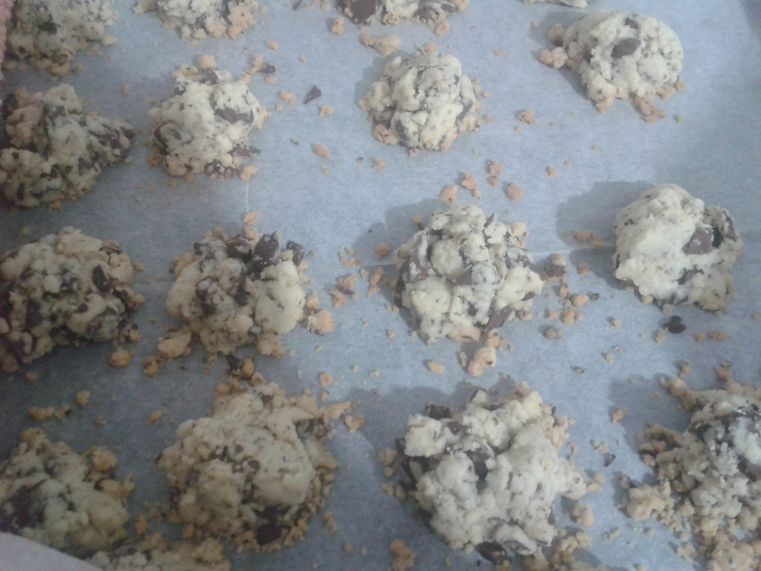 "לפניי האפייה מחממים את התנור, ובעזרת כף קפיצית קטנה של גלידה יוצרים כדורי מהבצק. הבצק הזה מתנהג אחרת מבצק פריך מסורתי, והוא הרבה יותר פירורי. ולכן נעזרים בכף הקפיצית כדי לקחת את הכמות הדרושה של הבצק, מגלגלים אותו מעט מאוד בין הידיים רק כדי ליצור כדור אחיד. גם השוקולד צ'יפס נוטה מעט לברוח מהבצק ולכן אפשר להדק אותו לכדורי הבצק בחלקם העליון. זה נשמע אולי מסובך, אבל זה ממש לא, מדובר בדקות ספורות עד שממלאים תבניות של כדורי בצק."
