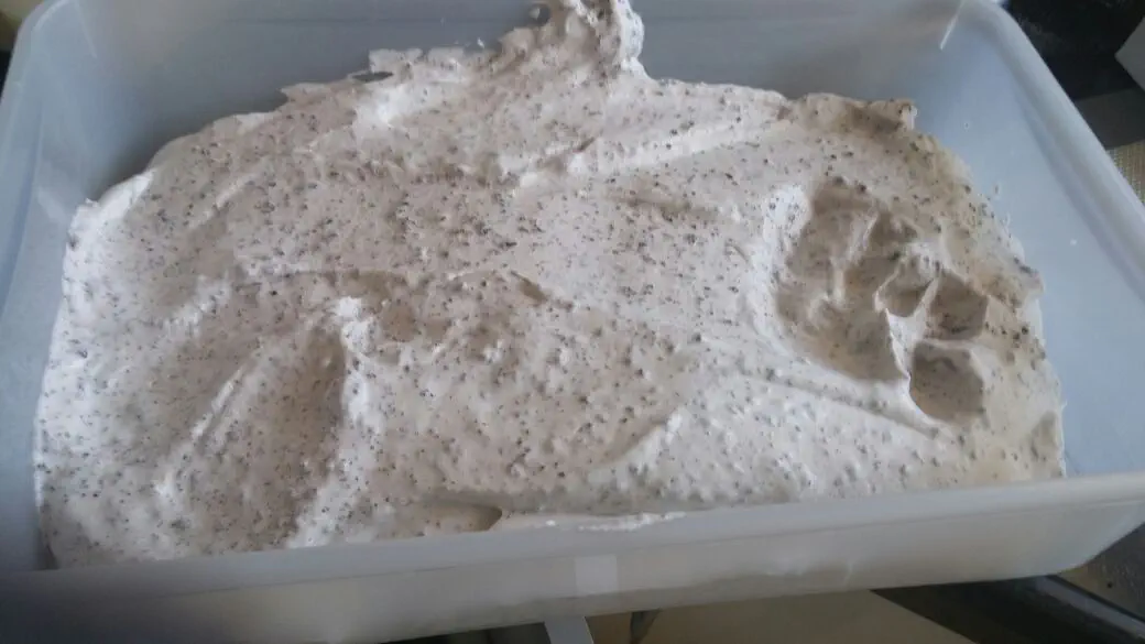 אפילו אכלנו כמה חתיכות קצת קפואות. עוגה עם חתיכות קרח בפנים.. כמו גלידה שהפשירו והקפיאו אותה 😕