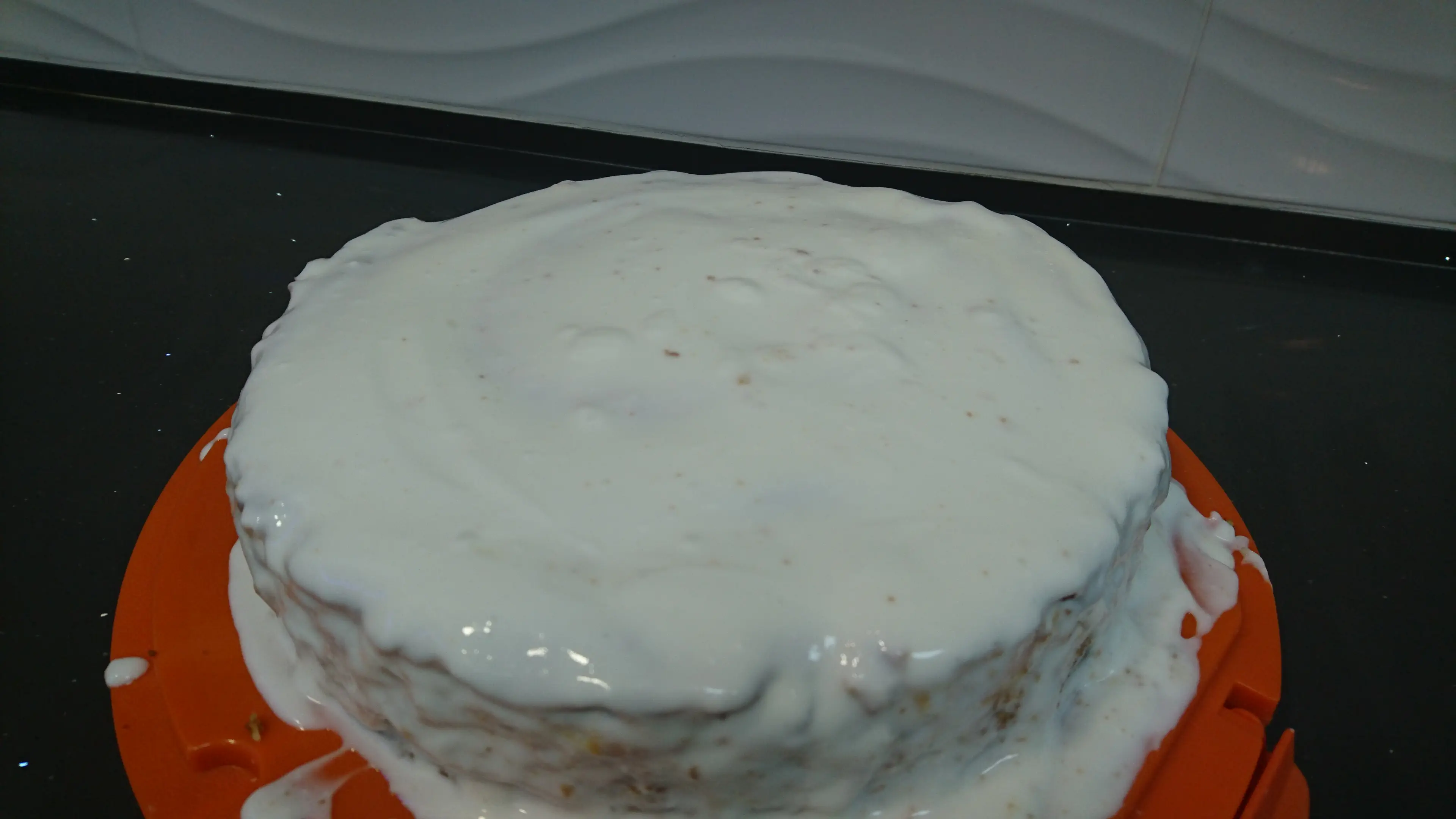 מזלפים לשלושה עד ארבעה עיגולים תלוי בגודל של התבנית ואופים עד להתייצבות, מקררים ומרכיבים לעוגה..