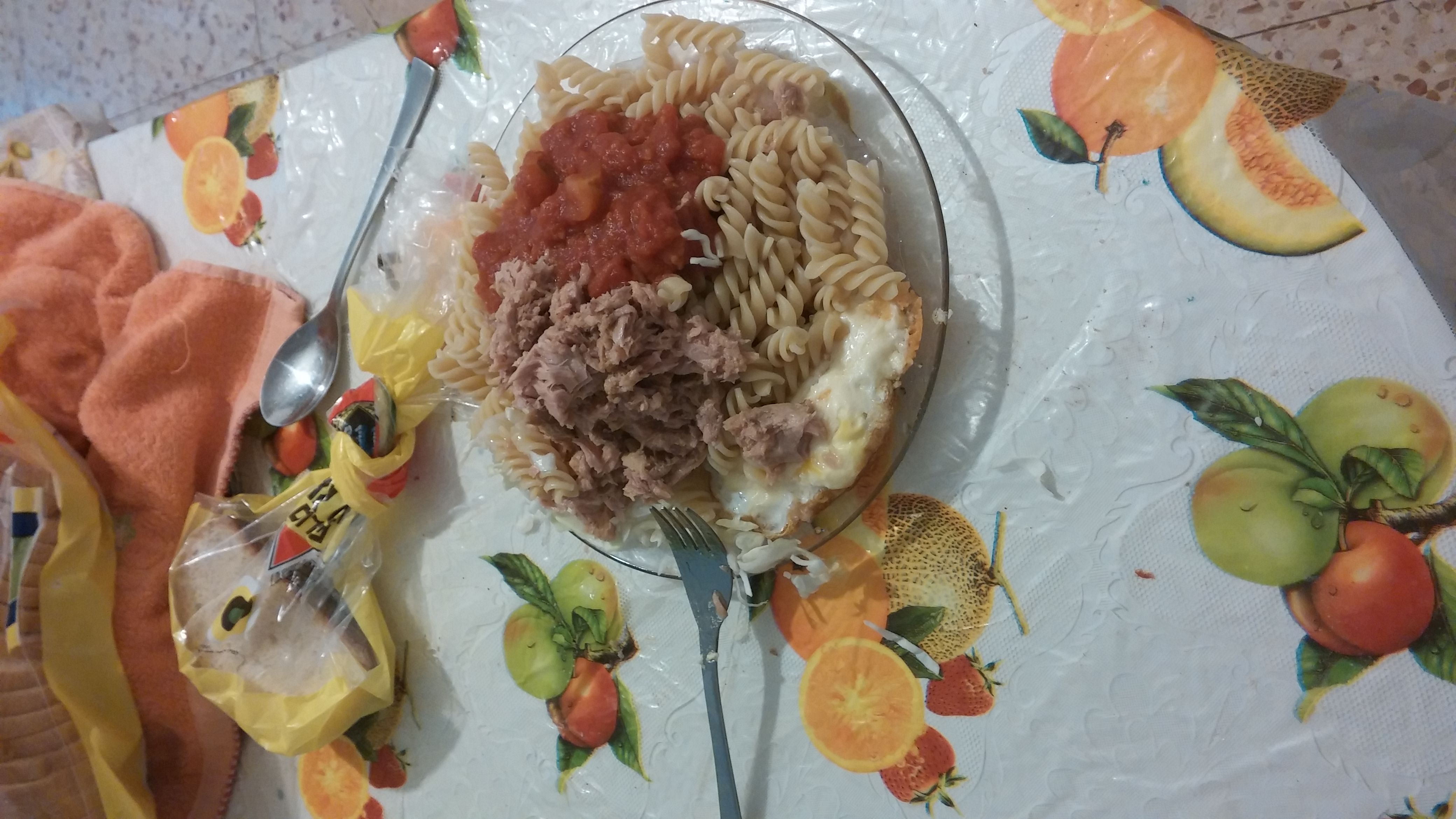 -פסטה ברוטב עגבניות, סלט ופרגיות.