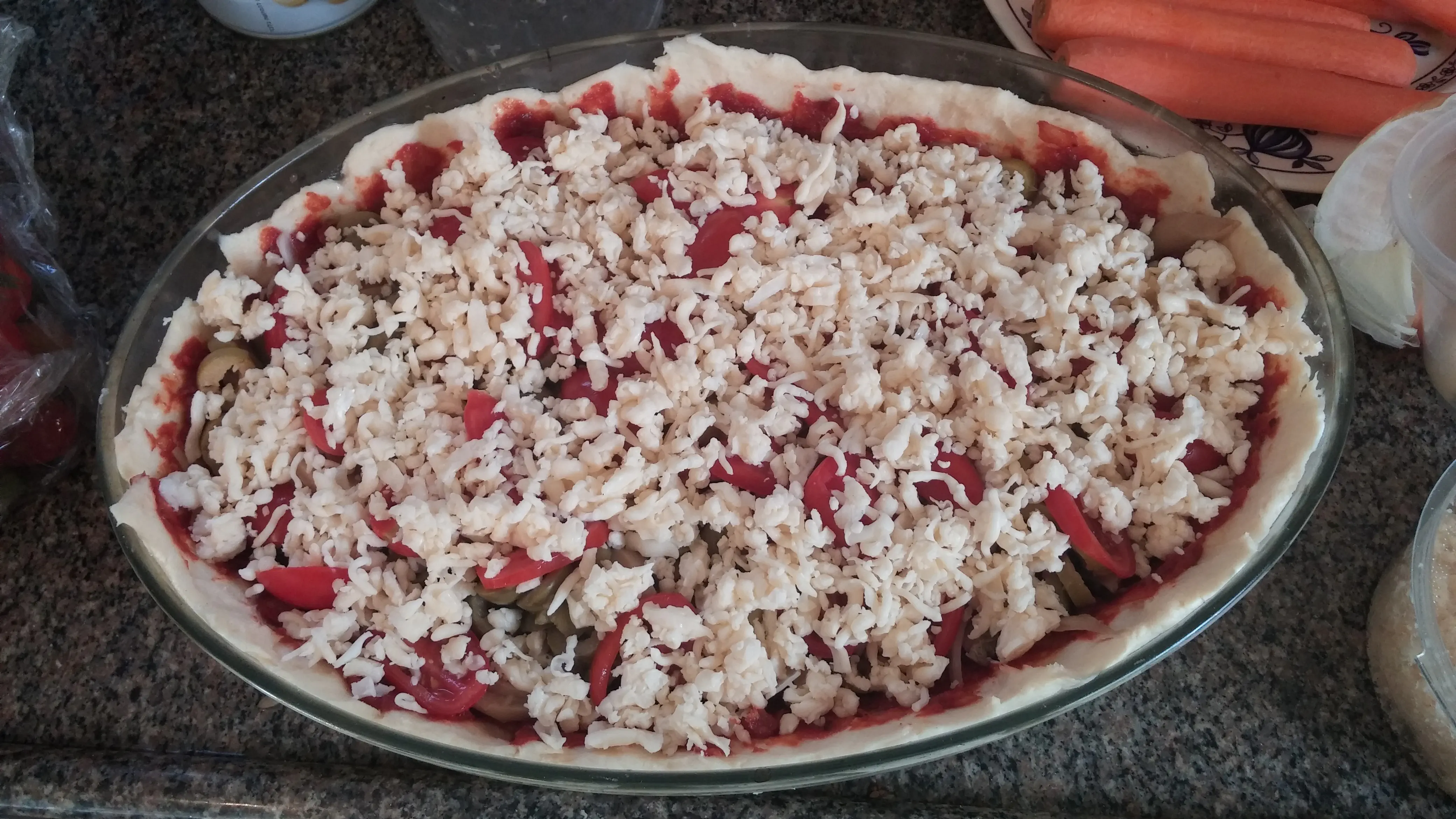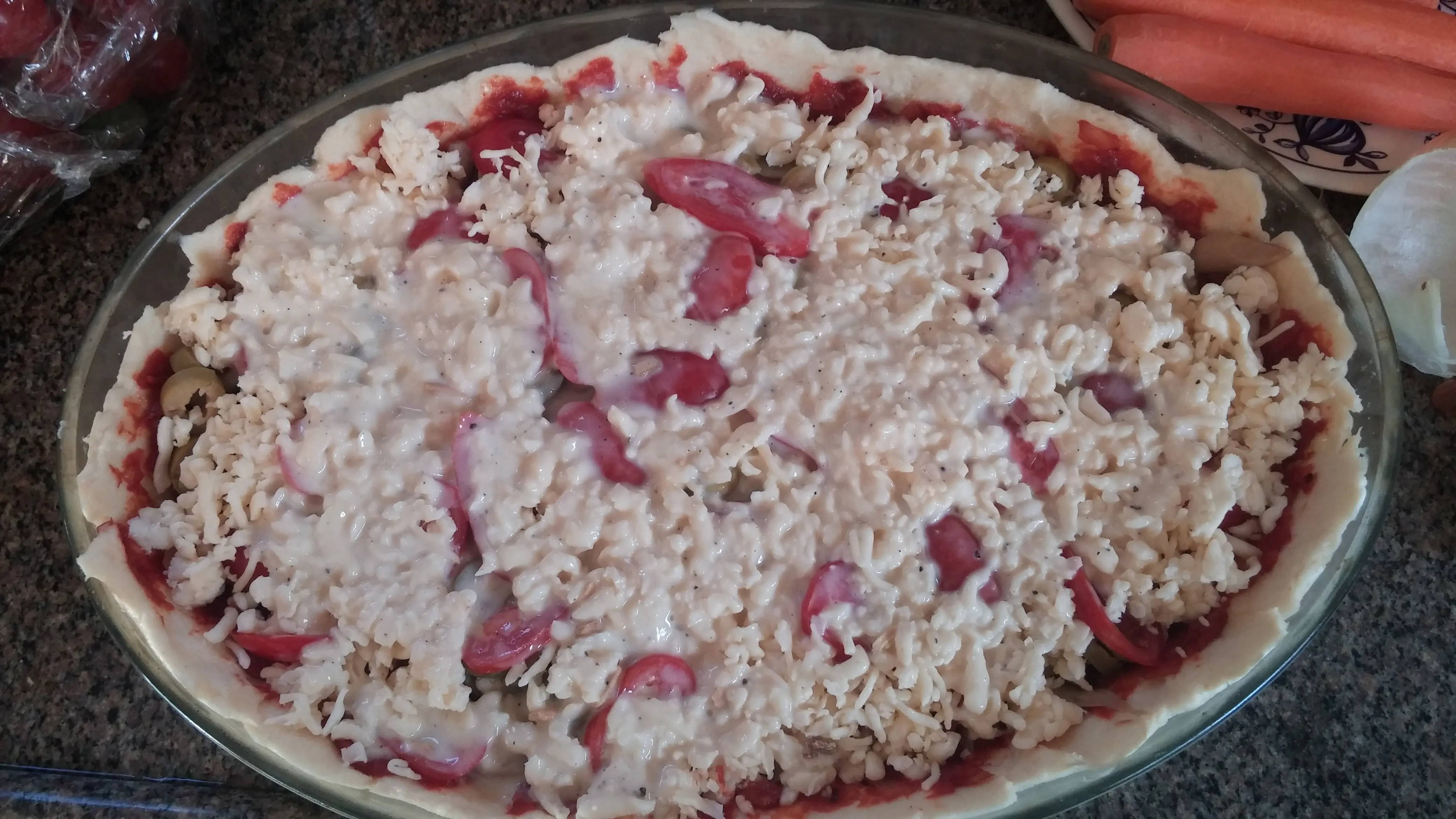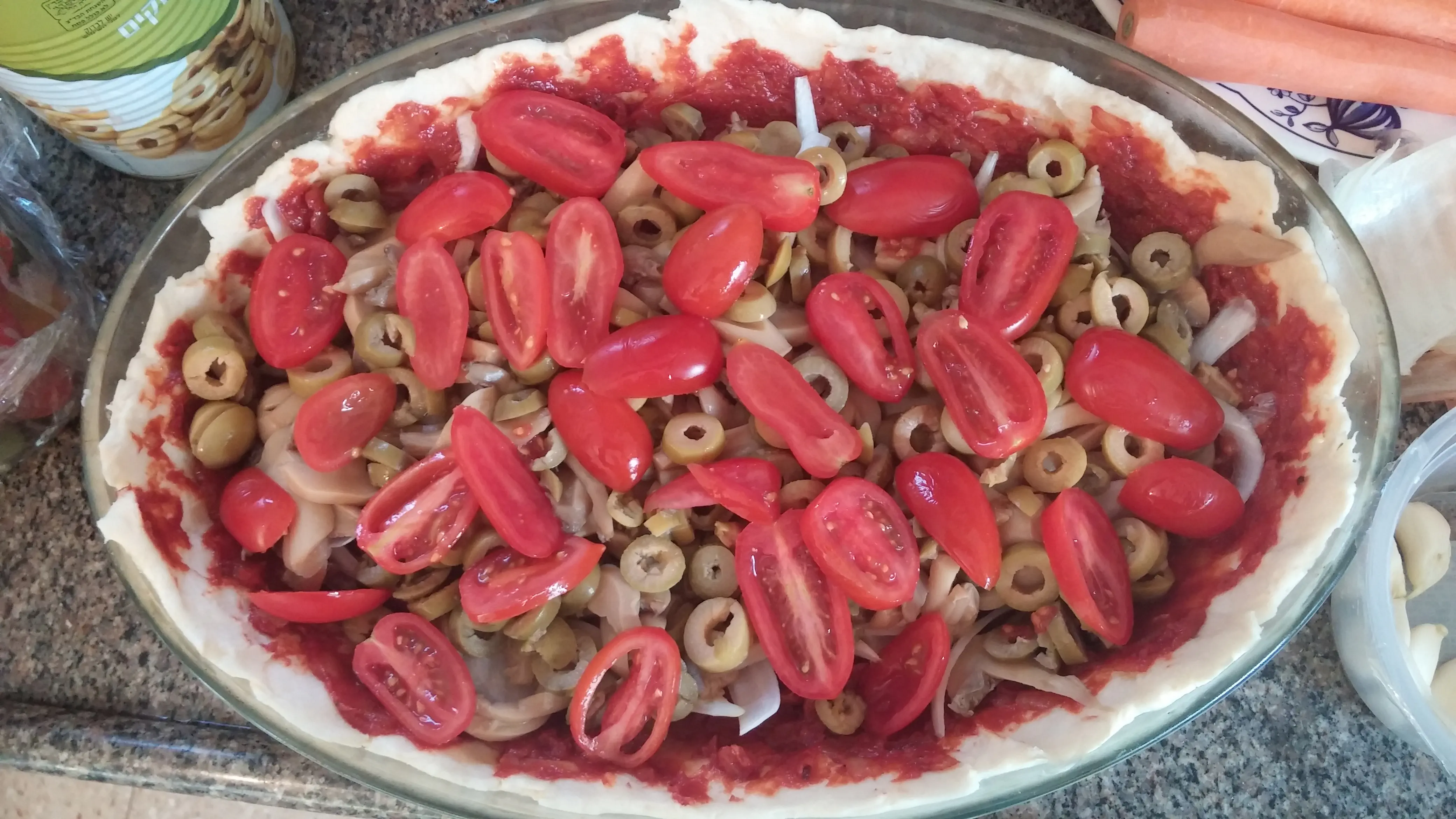 בצק לפיצה מרודד בעובי 1 ס"מ בגודל תבנית ( צריך 2 חתיכות כאלה ).. לשמן את הבצק קלות בשמן זית.