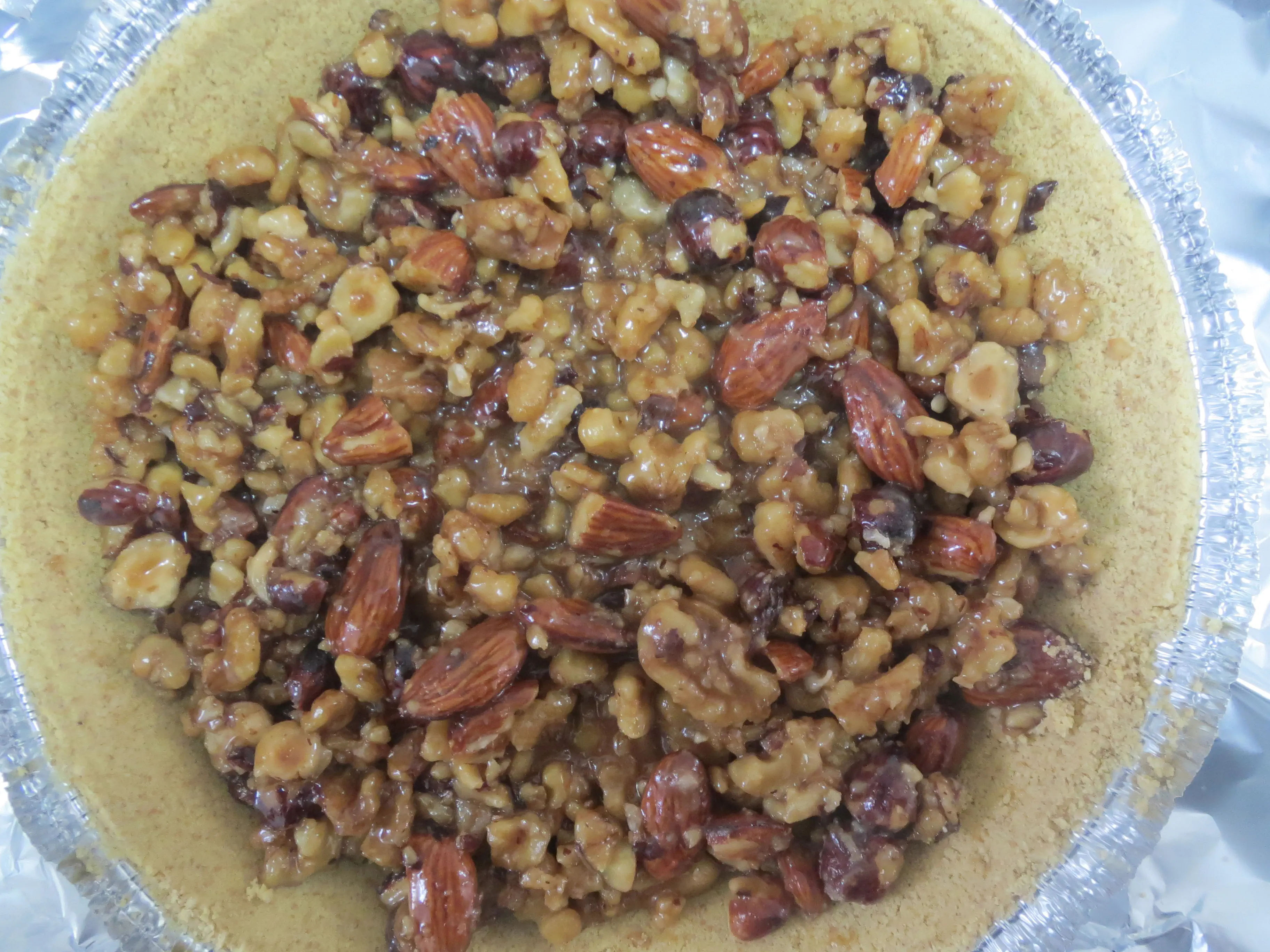 לשפוך את הכל מעל שכבת הפירורים ולפורר למעלה את הפירורים ששמרנו בצד.