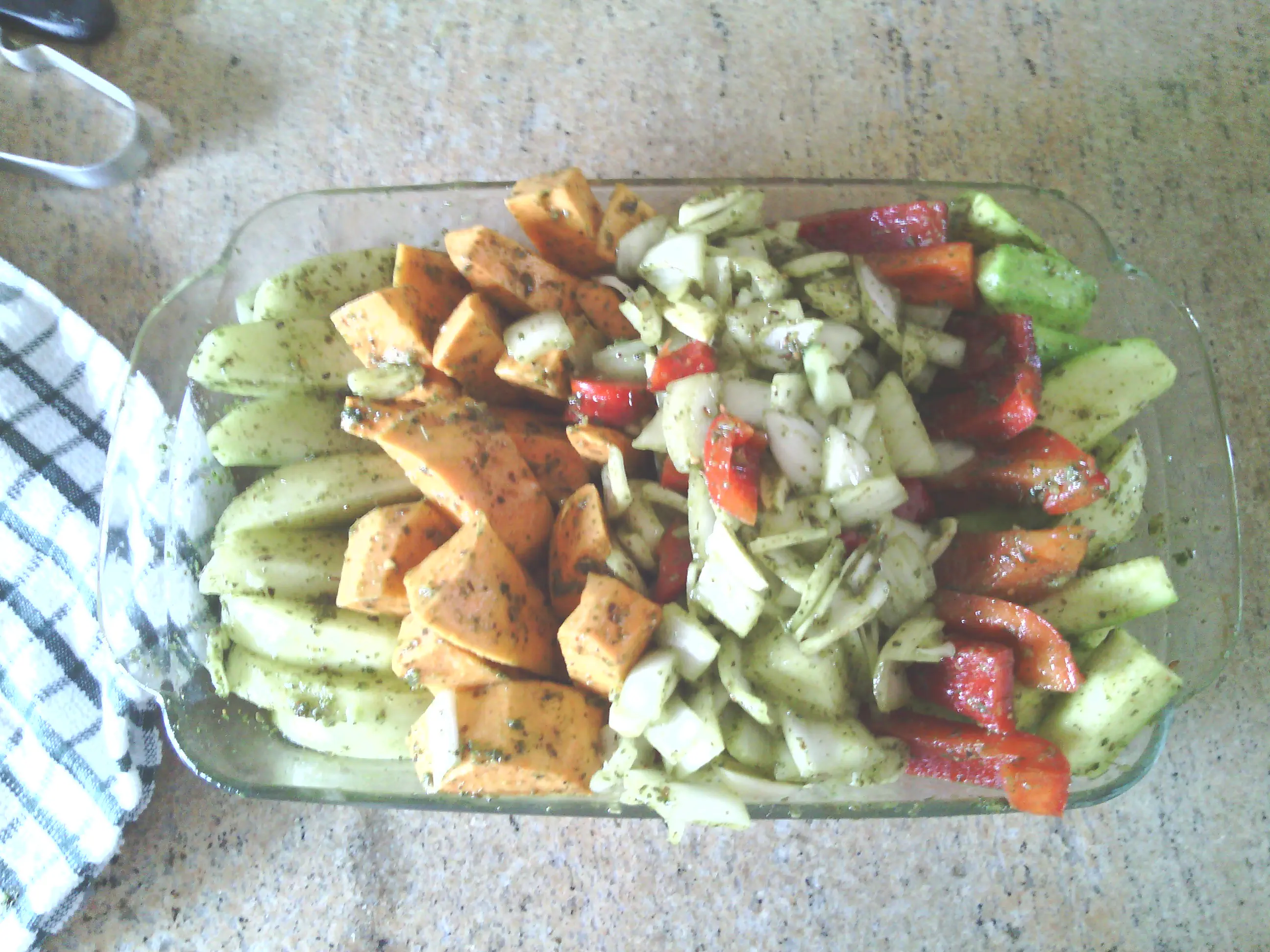 שמן קנולה, קוביות של בזיליקום קפוא, קוביות של פטרוזיליה קפואה, זעתר, פלפל, תימין(? עלים גרוסים ויבשים שעדיין רואים שהם היו עלים) ואגוז מוסקט מגורד וקצת מלח.