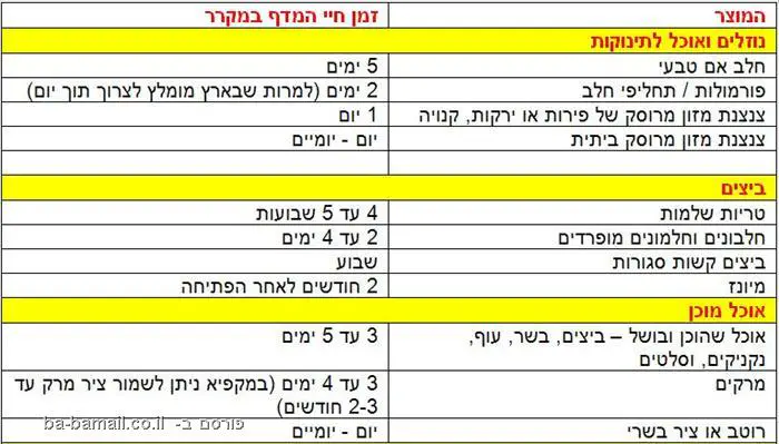 התאריכים המופיעים על אריזות, אינם מהווים מדריך לשימוש בטוח במוצר, אבל שימוש נכון בטבלה שלפניכם, ובהמלצות המצורפות, יעזרו לכם לשמור על האוכל הנמצא במקרר (בטמפרטורה של 4 מעלות), מלהתקלקל ולהפוך לסכנה בריאותית: