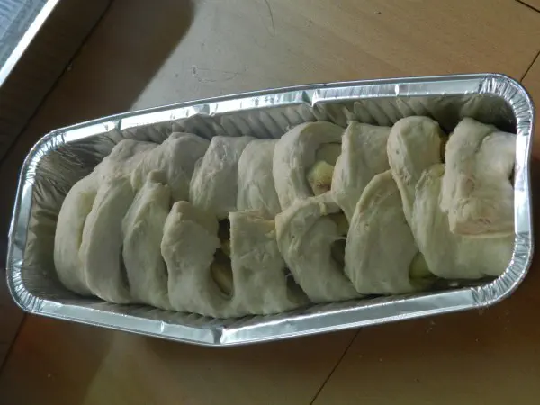 לחתוך תפוחים לפרוסות דקות יחסית, למלא בהם תבנית.