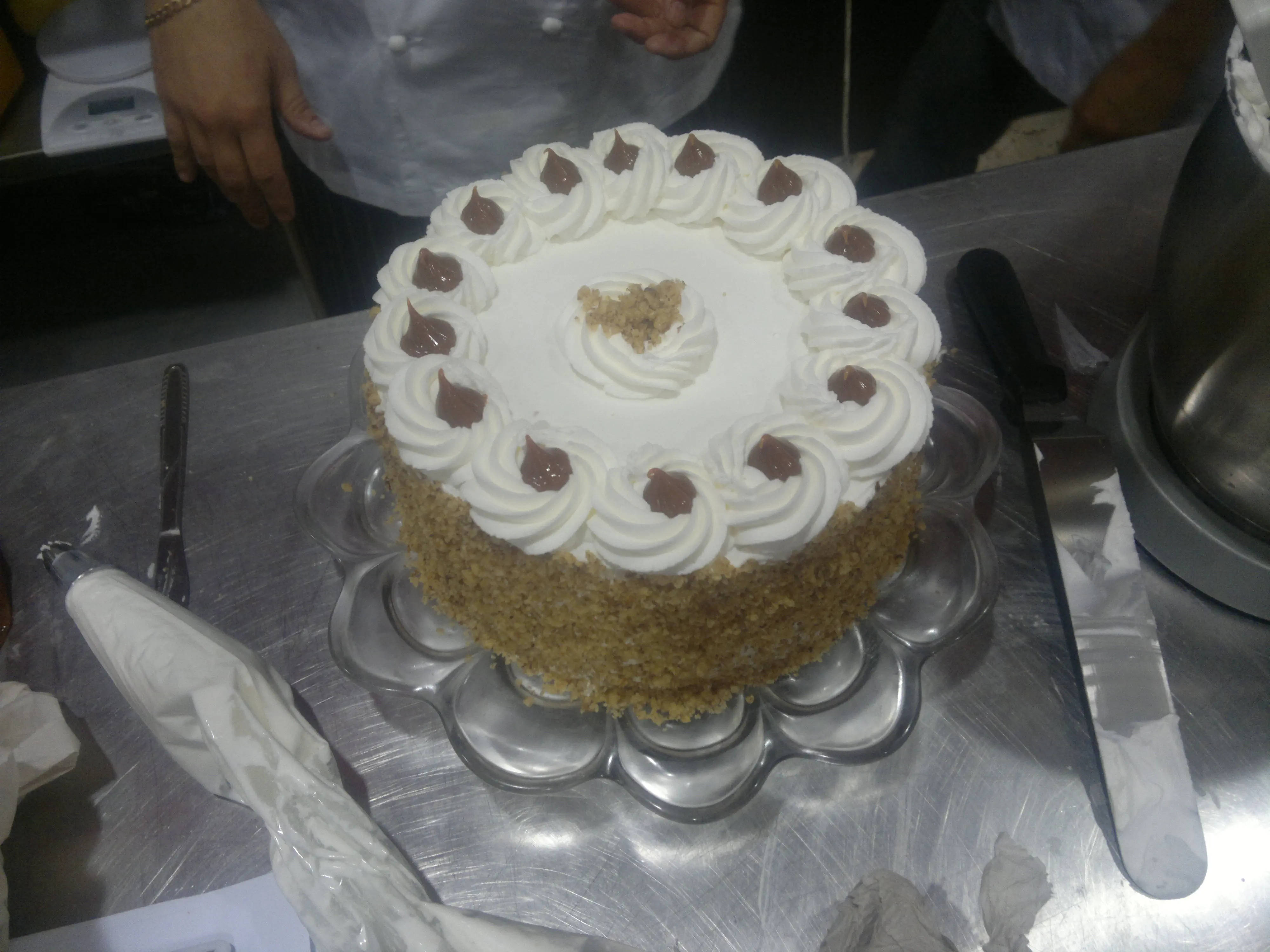 מורחים קרם על כל העוגה כולל דפנות, מיישרים ומקשטים בריבת חלב וקרם, בדפנות מצמידים אגוזים קצוצים...